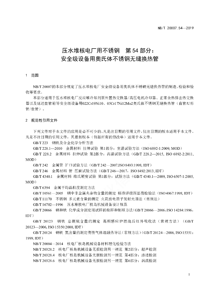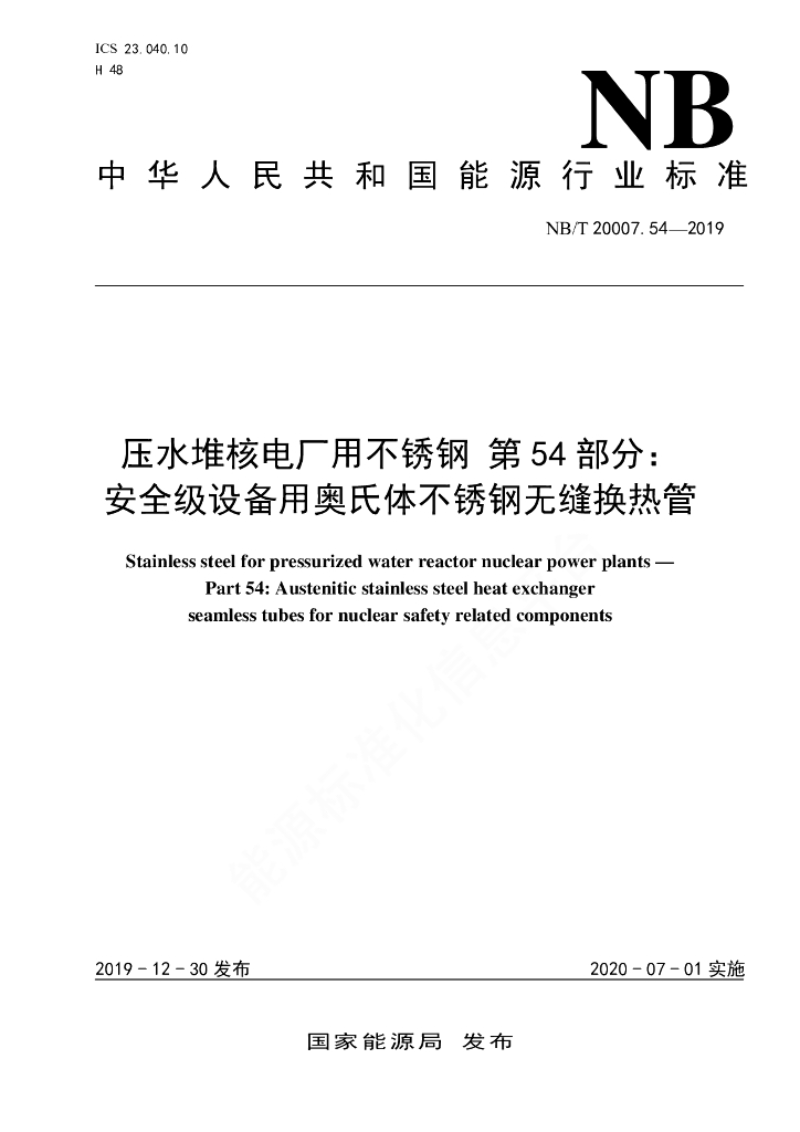 NB/T 20007.54-2019 压水堆核电厂用不锈钢 第54部分:安全级设备用奥氏体不锈钢无缝换热管