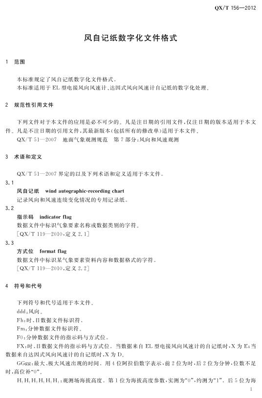 QX/T 156-2012 风自记纸数字化文件格式