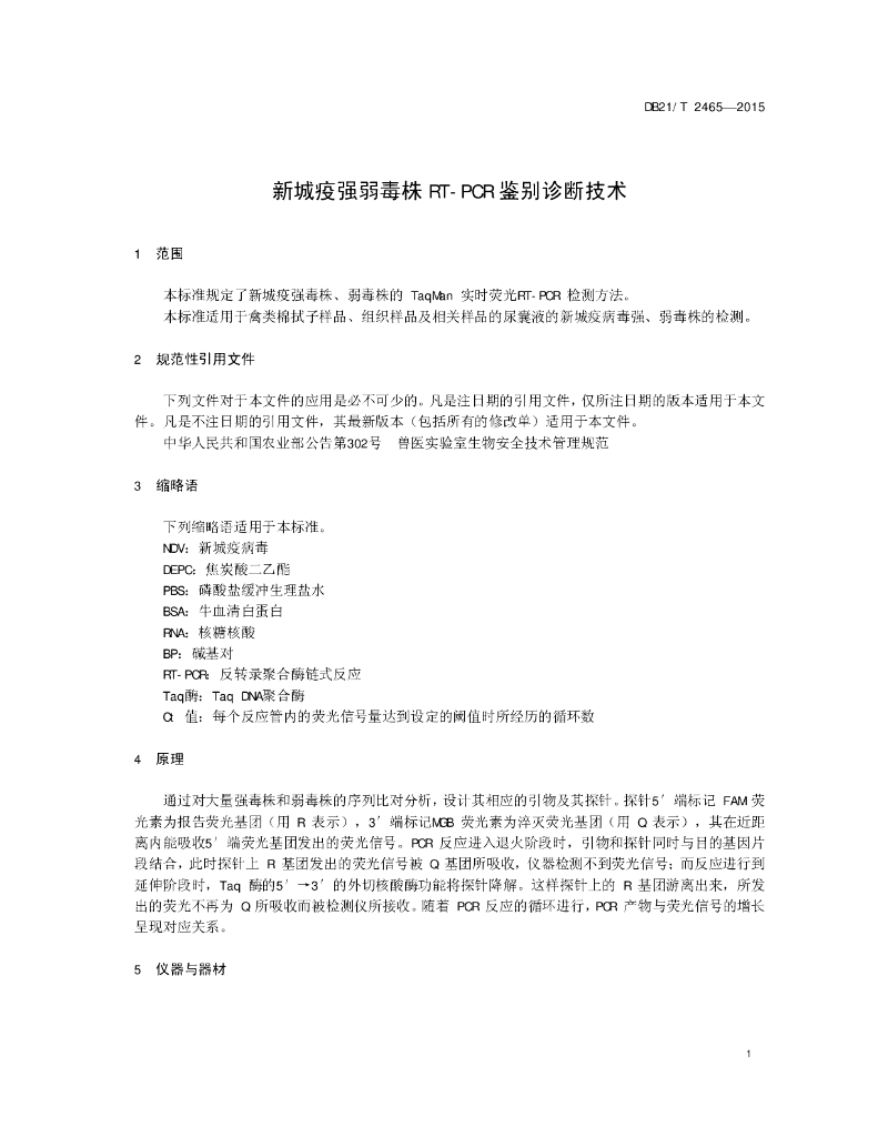 DB21/T 2465-2015 新城疫病毒强弱毒株RT-PCR鉴别诊断技术