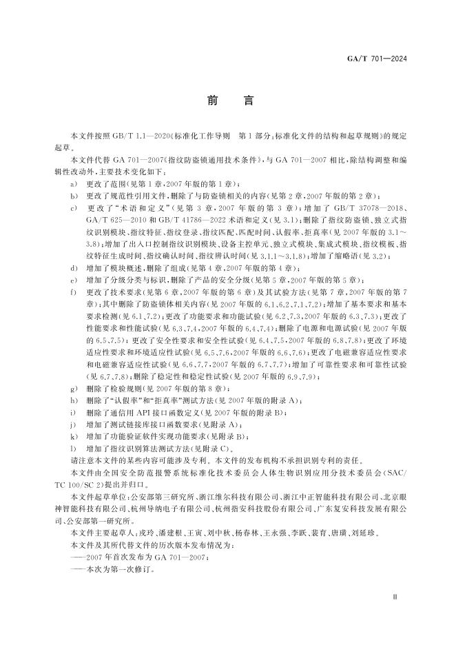 GA/T 701-2024 安全防范 指纹识别应用 出入口控制指纹识别模块通用规范