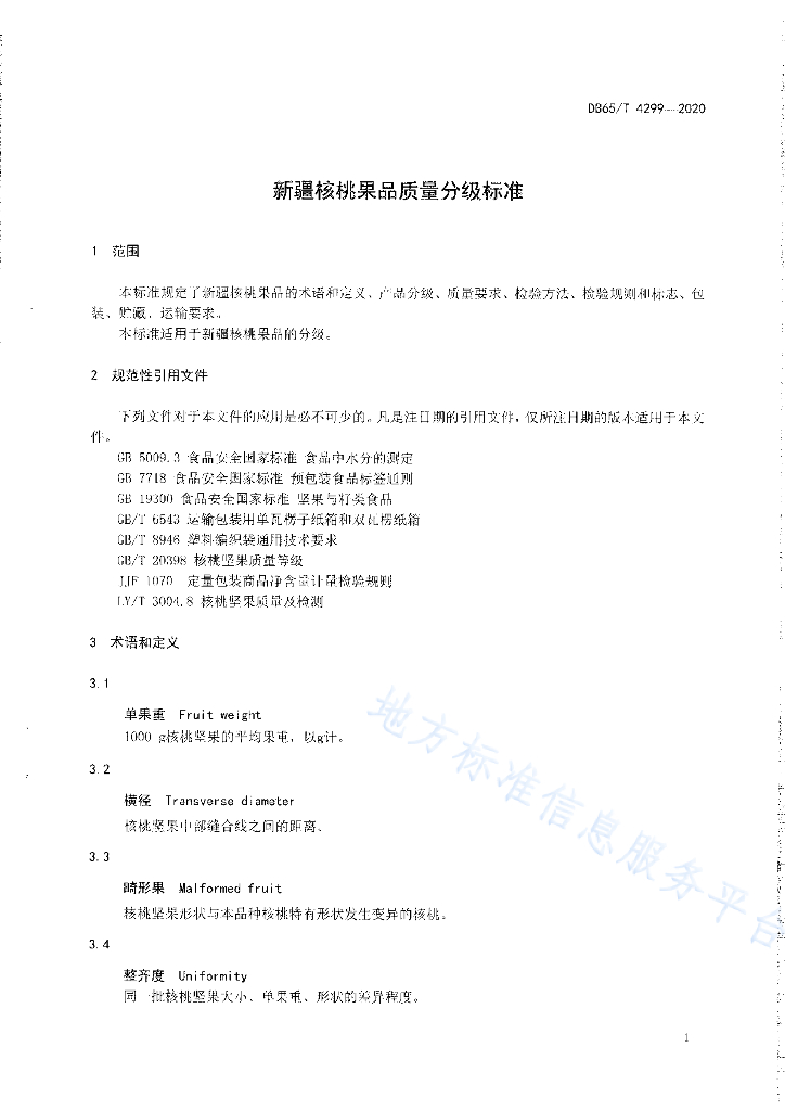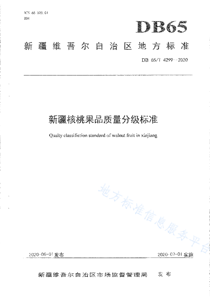 DB65/T 4299-2020 新疆核桃果品质量分级标准