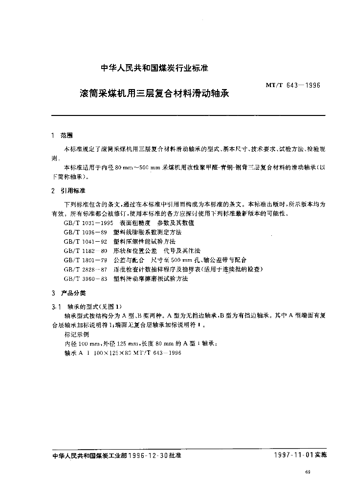 MT/T 643-1996 滚筒采煤机用三层复合材料滑动轴承