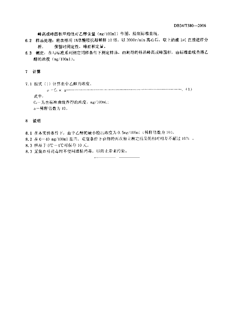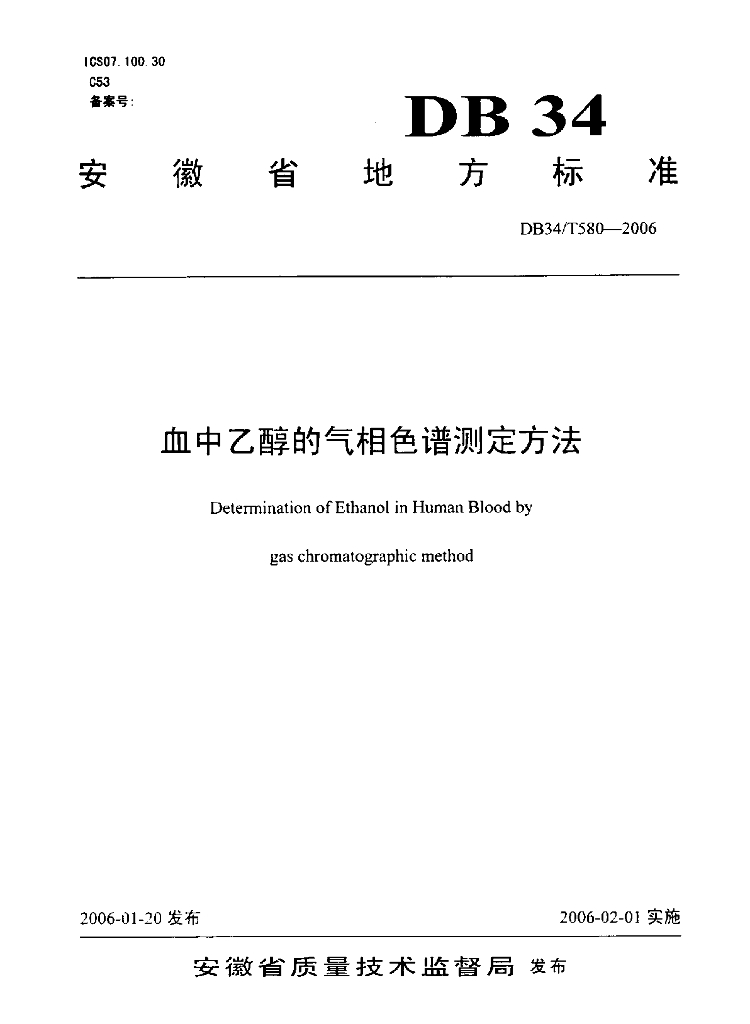 DB34/T 580-2006 血中乙醇的气相色谱测定方法