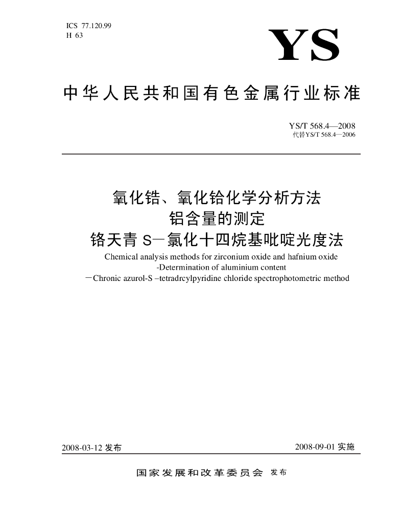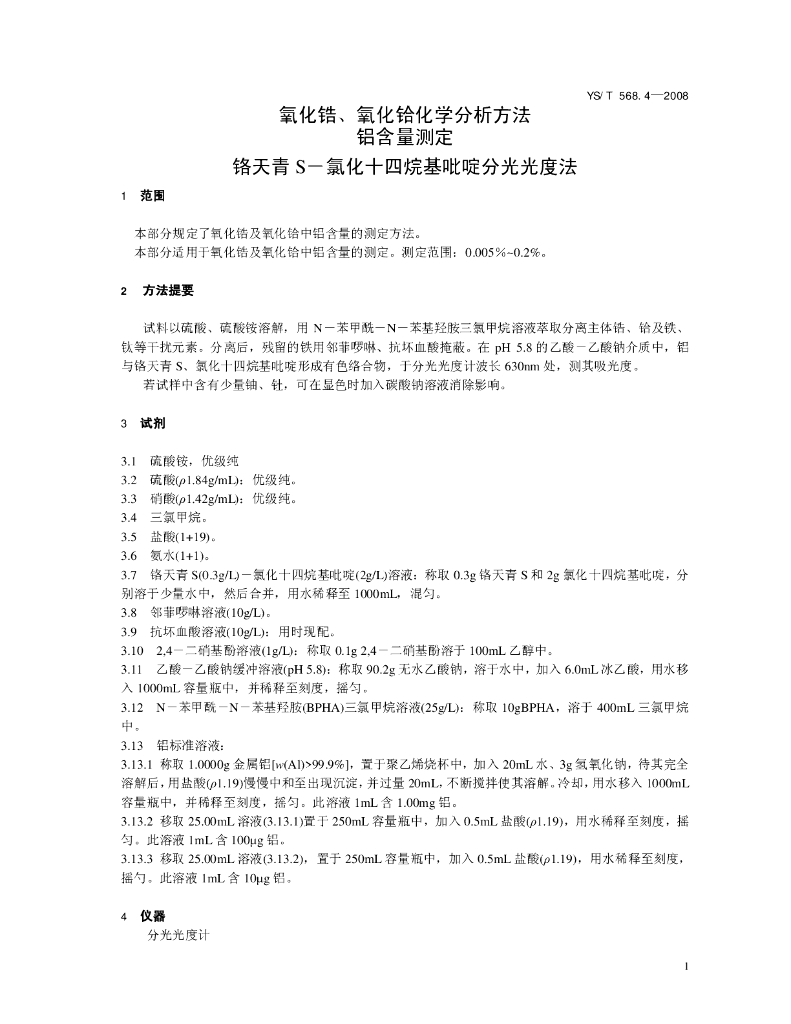YS/T 568.4-2008 氧化锆、氧化铪化学分析方法 铝含量的测定 铬天青S-氯化十四烷基吡啶光度法