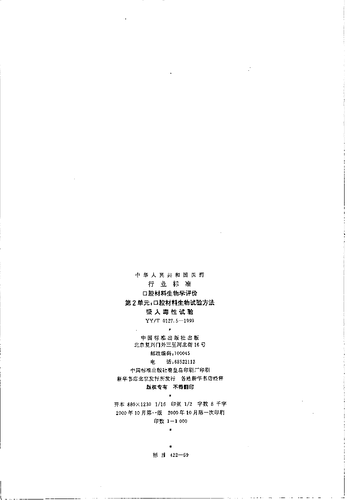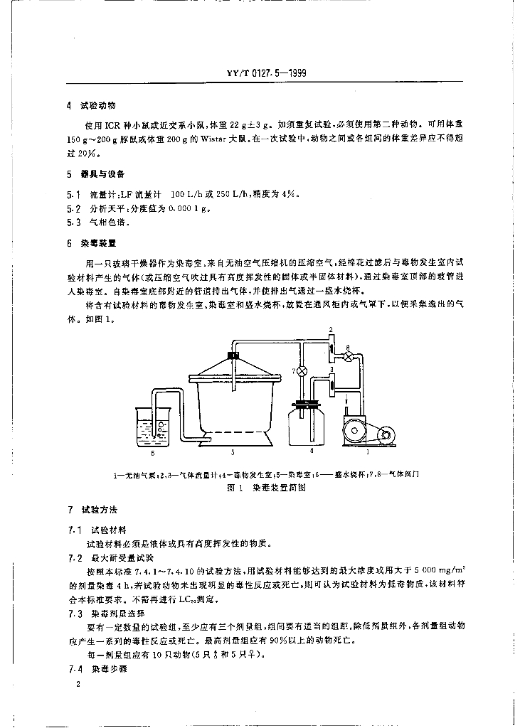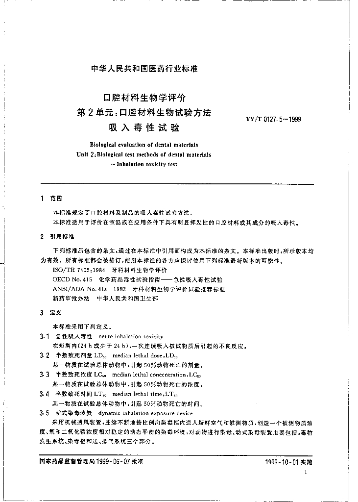 YY/T 0127.5-1999 口腔材料生物学评价 第2单元:口腔材料生物试验方法吸人毒性试验