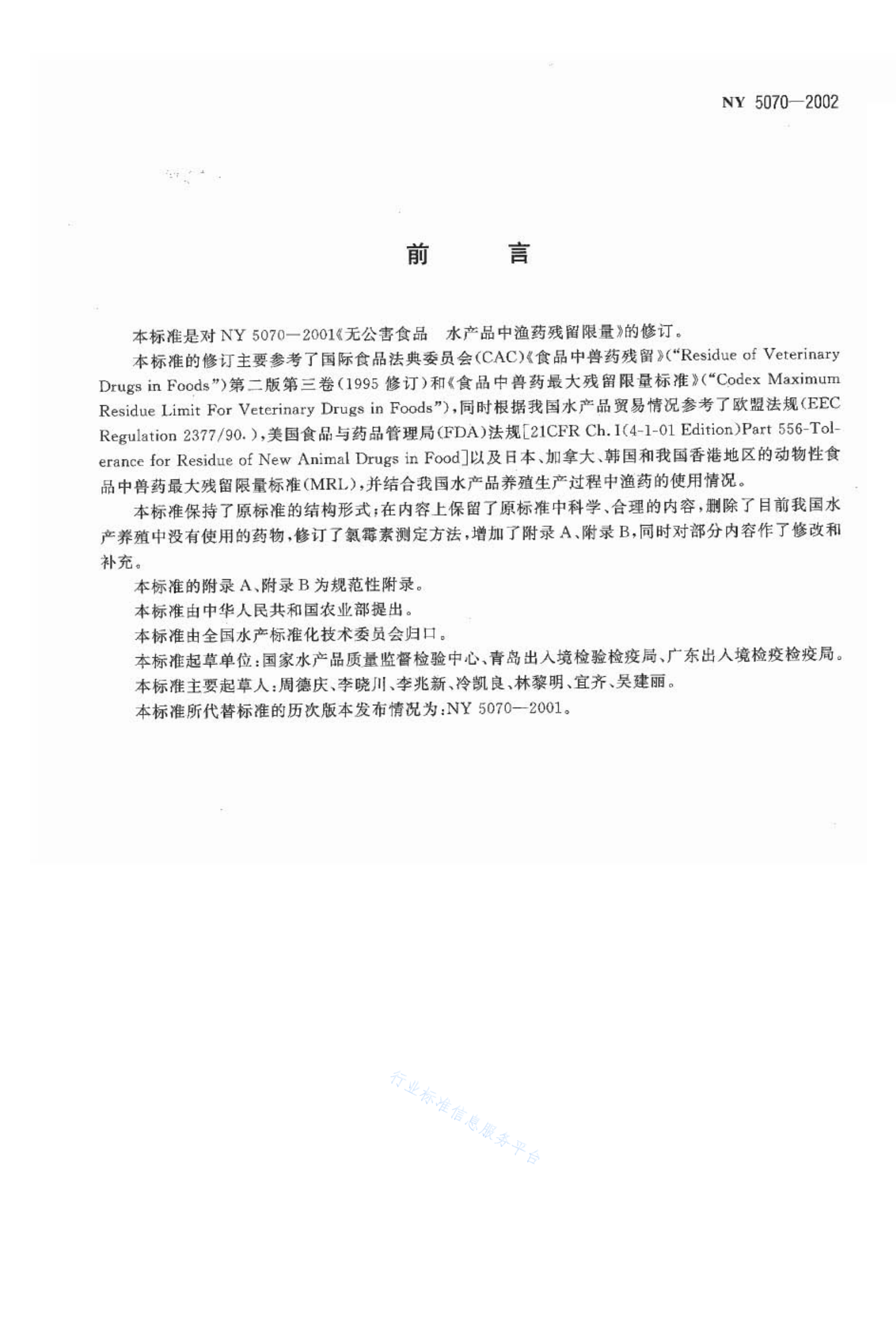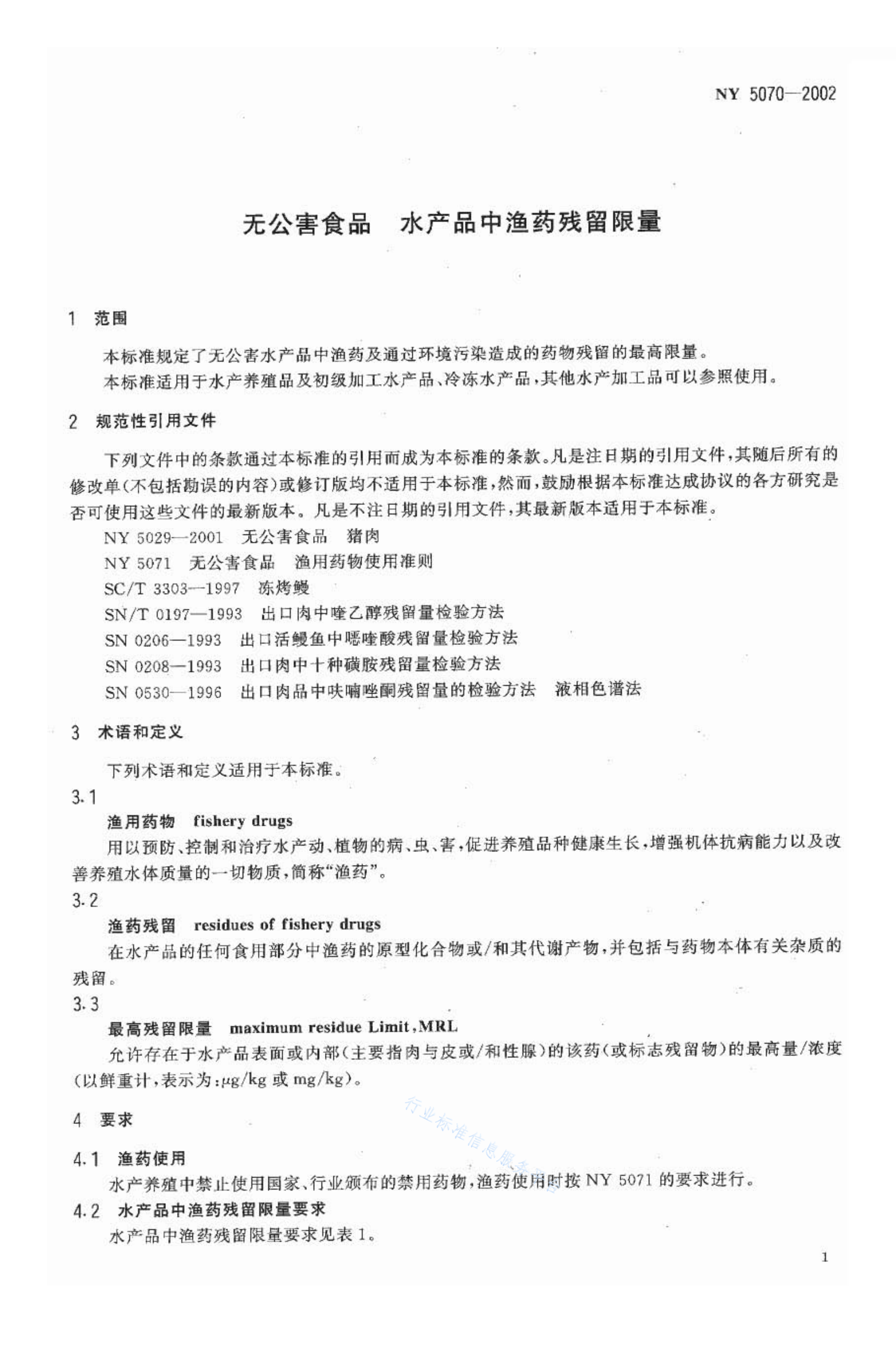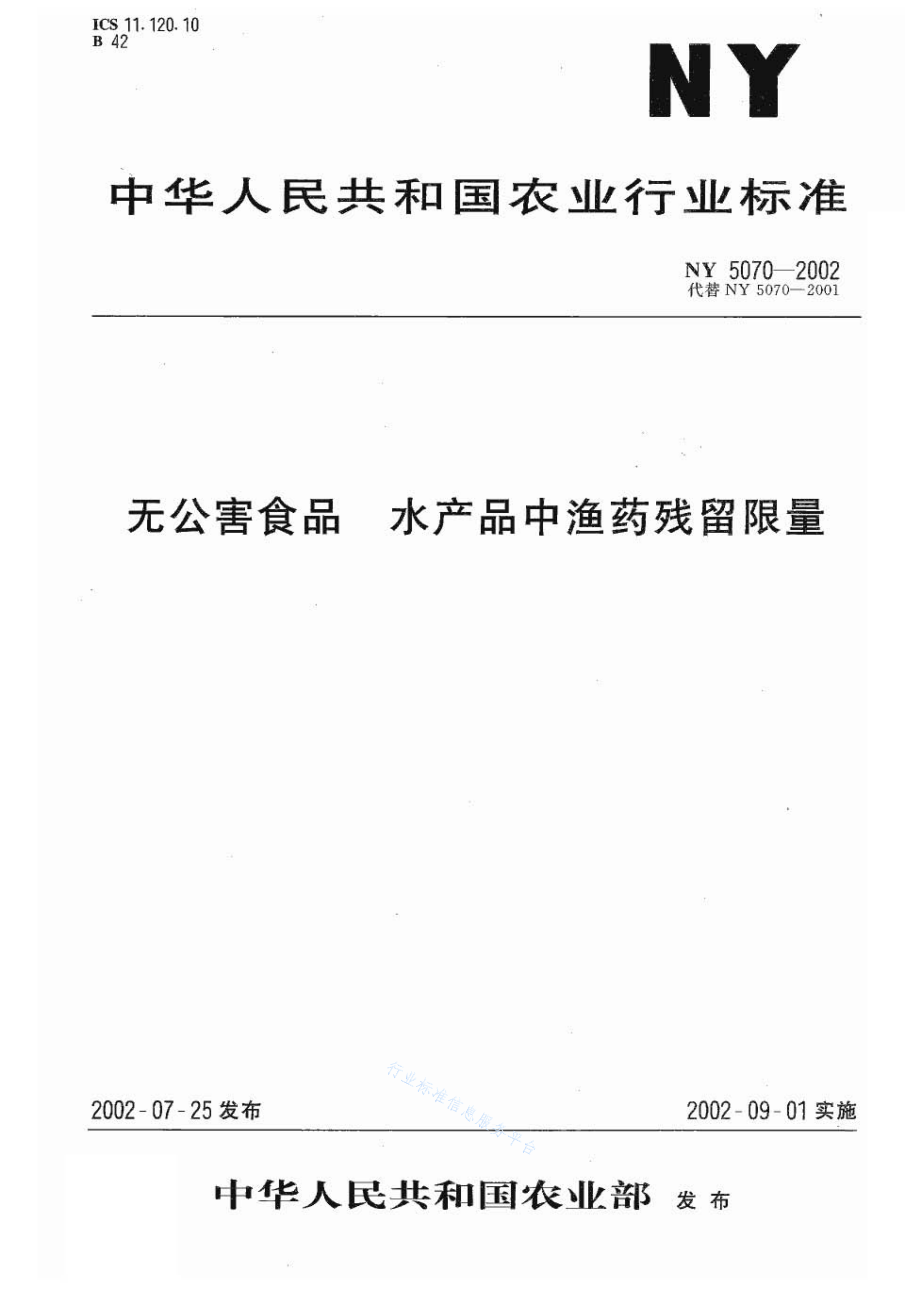 NY 5070-2002 无公害食品 水产品中鱼药残留限量