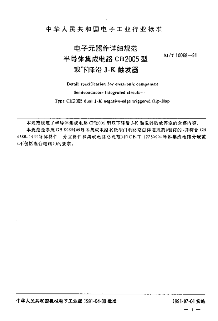 SJ/T 10068-1991 电子元器件详细规范 半导体集成电路CH2005型双寸降沿J-K触发器