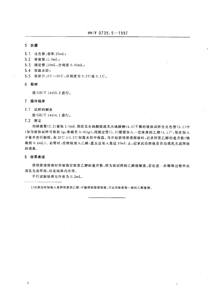 SN/T 0735.5-1997 出口芳香油、单离和合成香料乙醇溶解度的测定方法