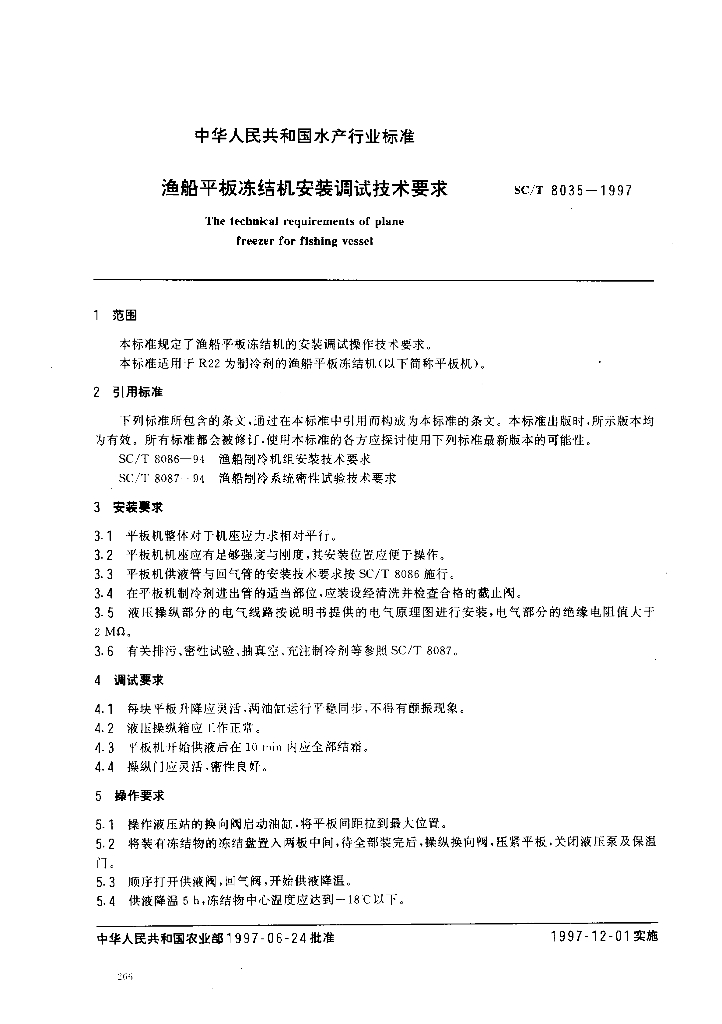 SC/T 8035-1997 渔船平板冻结机安装调试技术要求