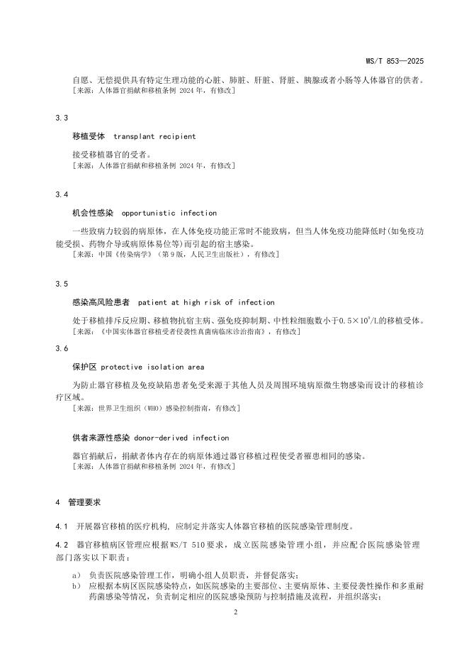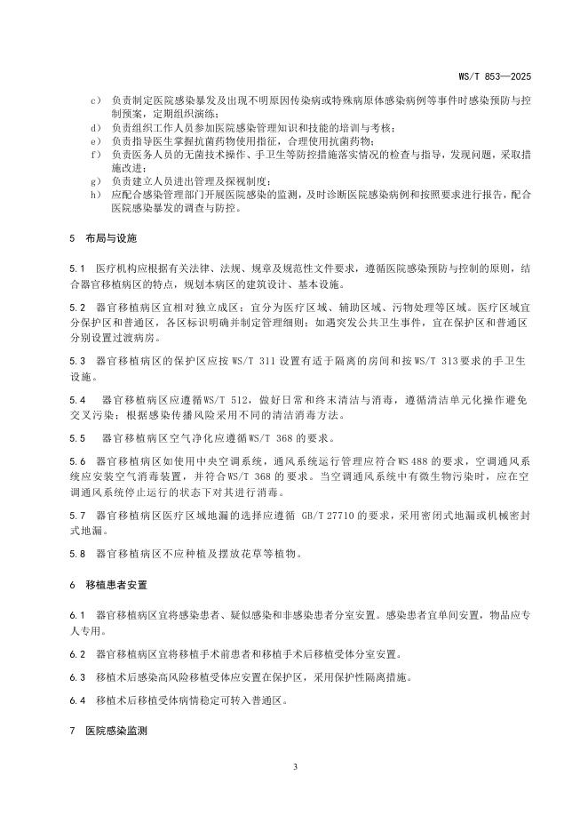 WS/T 853-2025 器官移植病区医院感染预防与控制标准