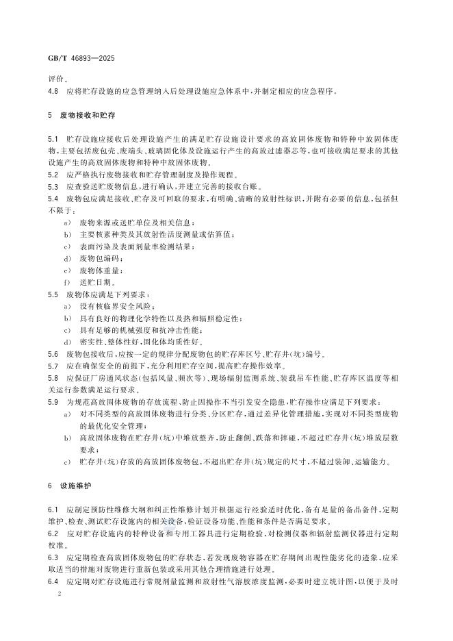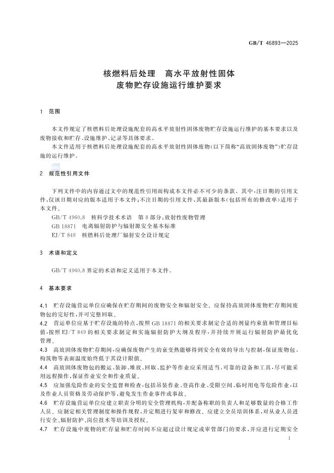 GB/T 46893-2025 核燃料后处理 高水平放射性固体废物贮存设施运行维护要求