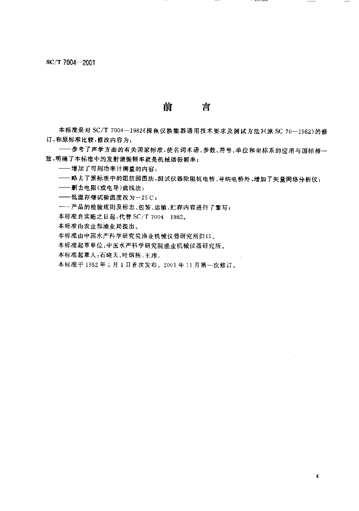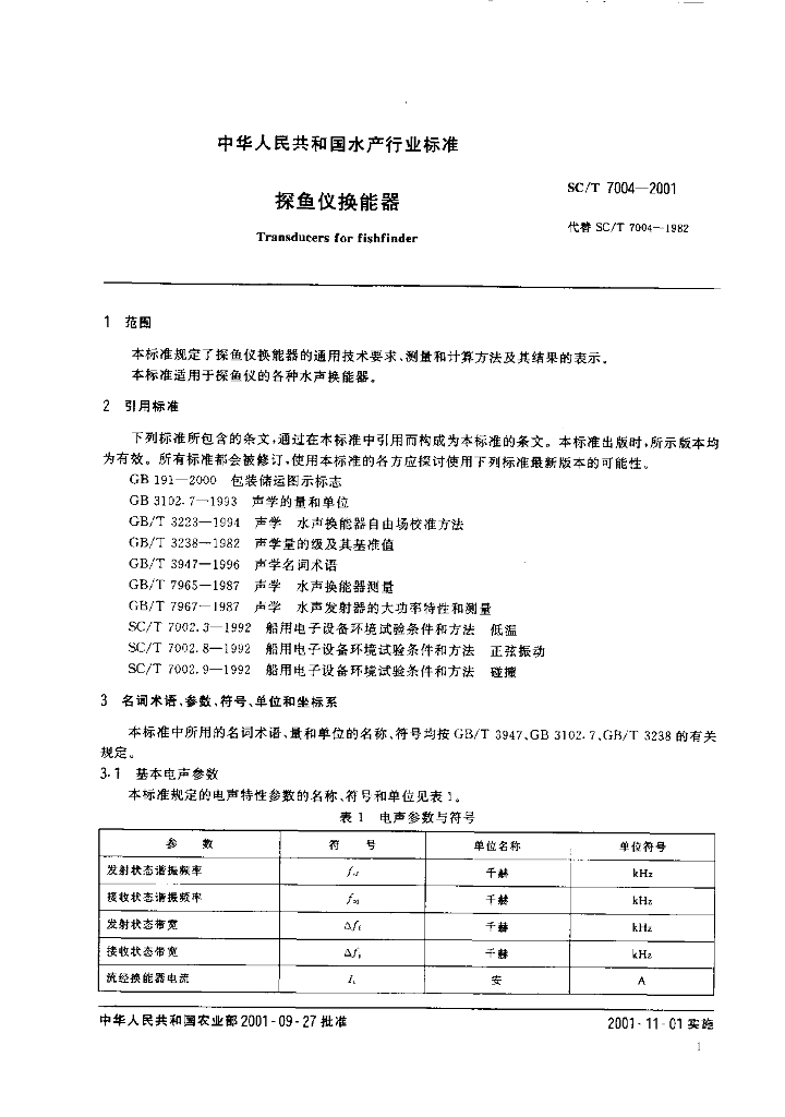 SC/T 7004-2001 探鱼仪换能器