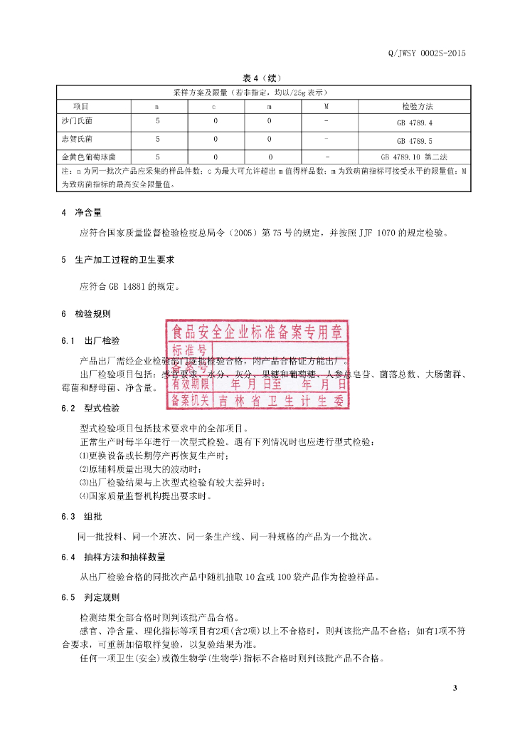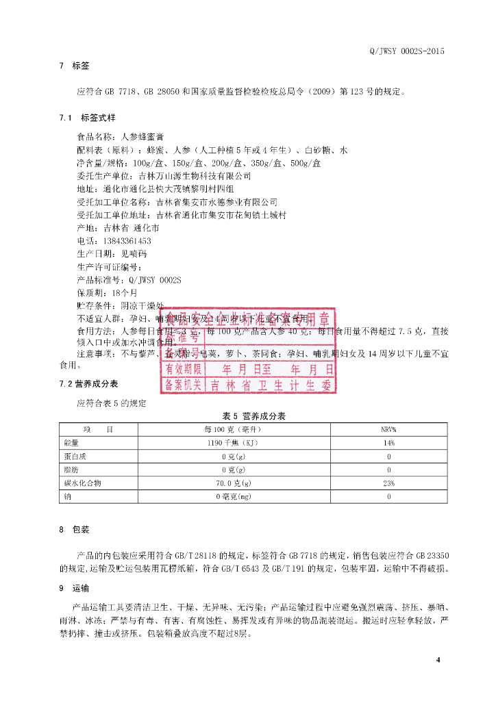 Q/JWSY 0002S-2015 吉林万山源生物科技有限公司 人参蜂蜜膏