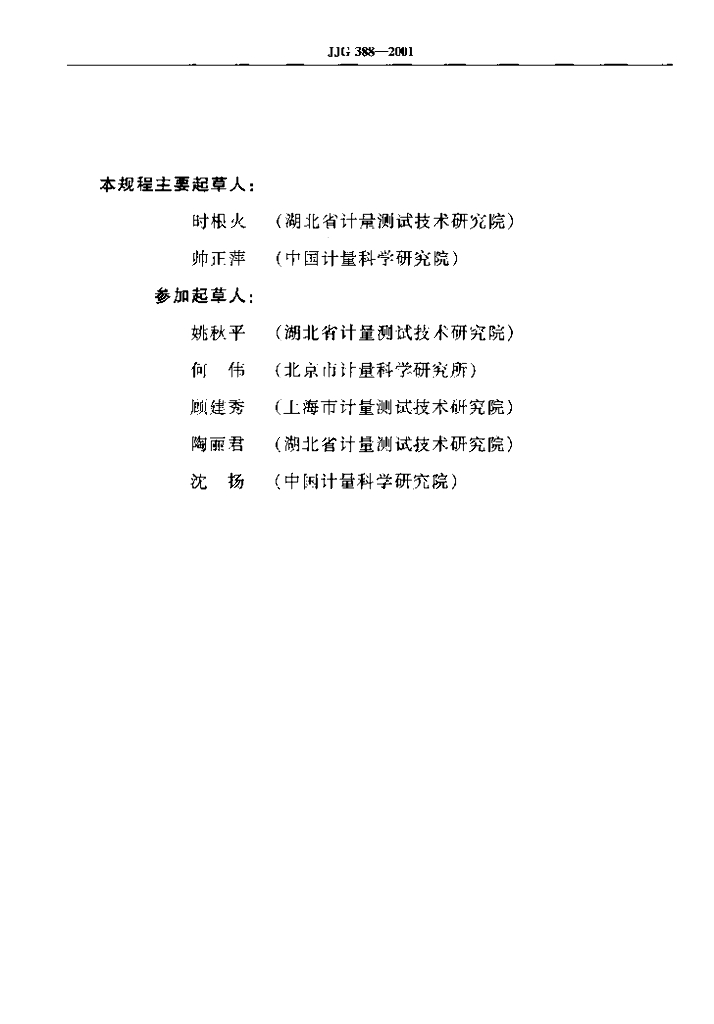 时根火(湖北省计量测试技术研究院)、帅正萍(中国计量科学研究院)、姚秋平(湖北省计量测试技术研究院)、何伟(北京市计量科学研究所)、顾建秀(上海市计量测试技术研究院)、陶丽君(湖北省计量测试技术研究院)、沈扬(中国计量科学研究院)
