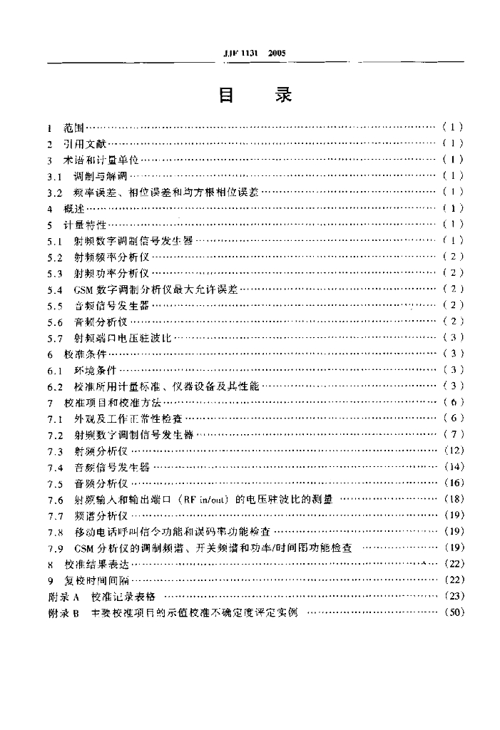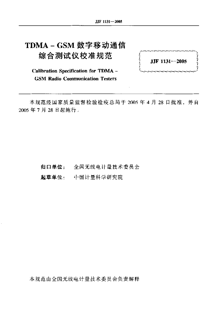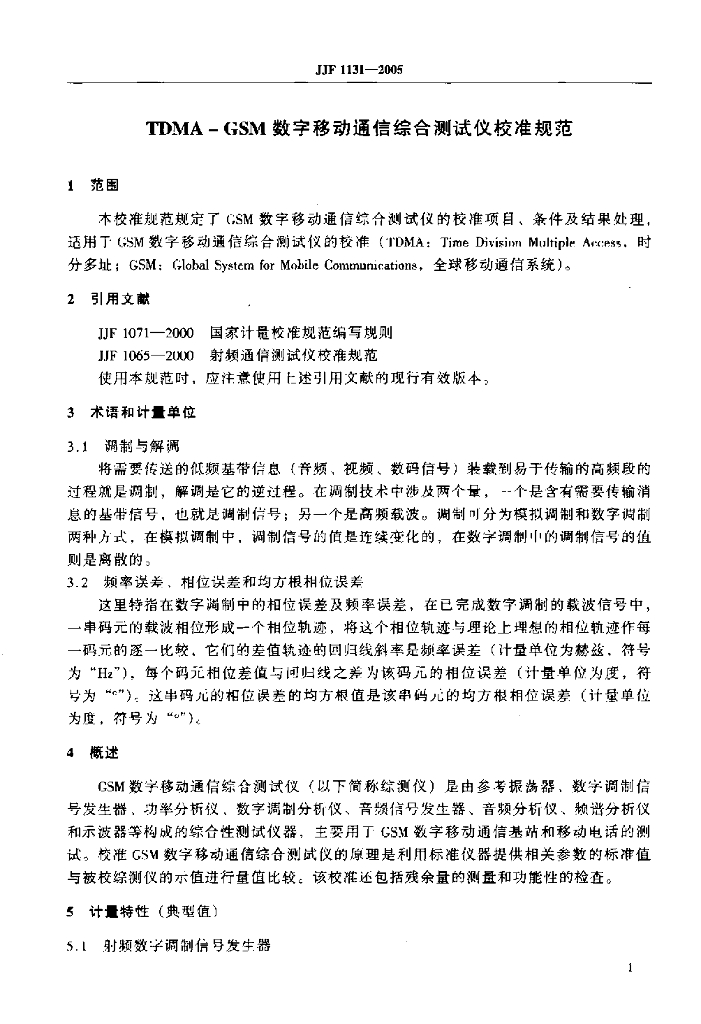JJF 1131-2005 TDMA-GSM数字移动通信综合测试仪校准规范