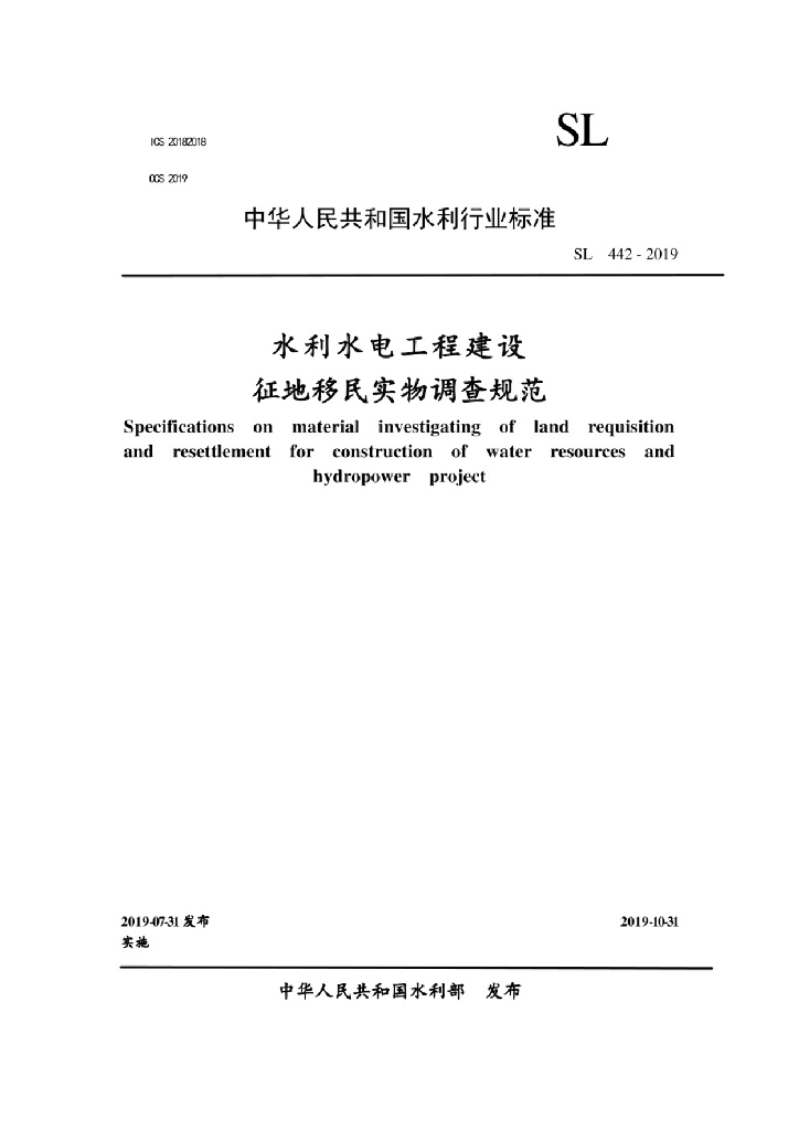 SL 442-2019 水利水电工程建设征地移民实物调查规范
