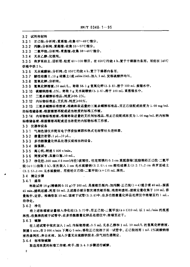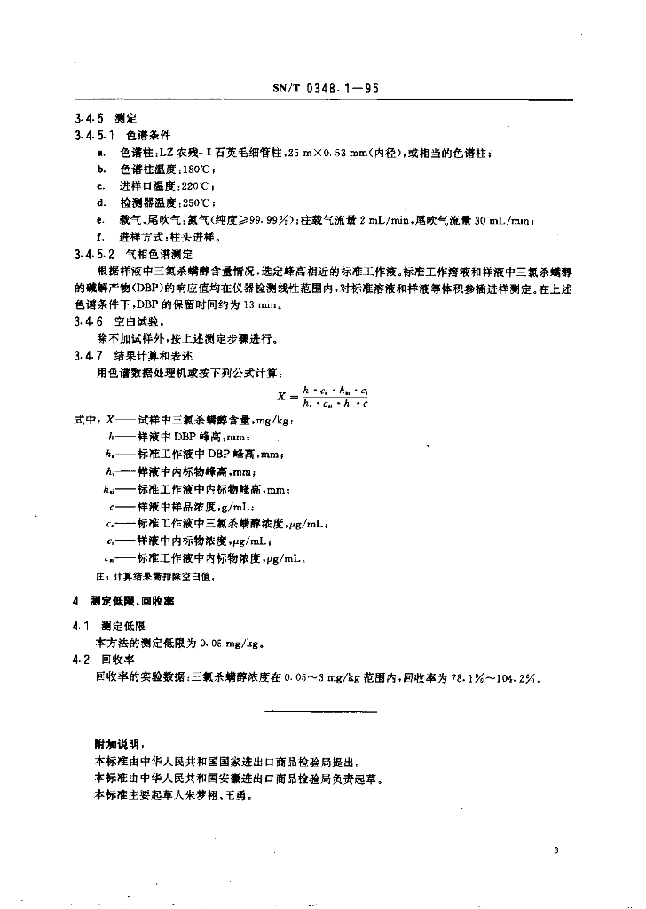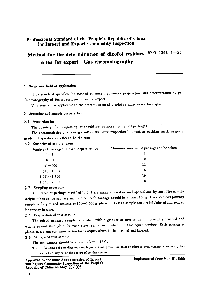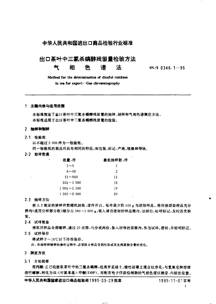 SN/T 0348.1-1995 出口茶叶中三氯杀螨醇残留量检验方法 气相色谱法