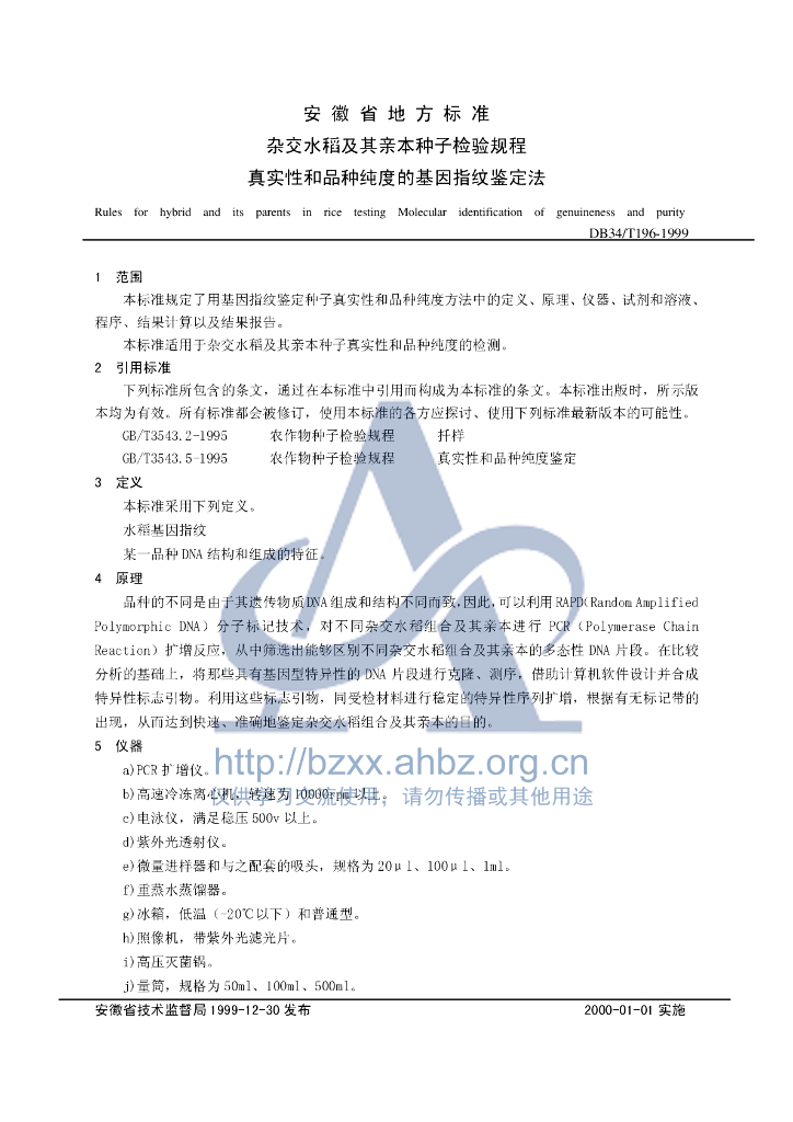 DB34/T 196-1999 杂交水稻及其亲本种子检验规程真实性和品种纯度的基因指纹鉴定法