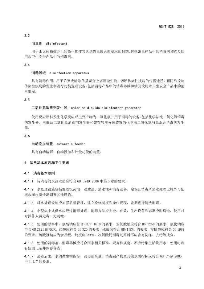 WS/T 528-2016 小型集中式供水消毒技术规范