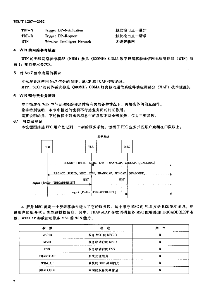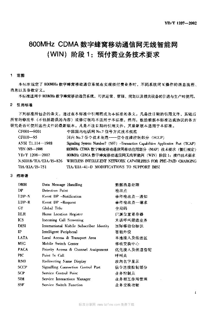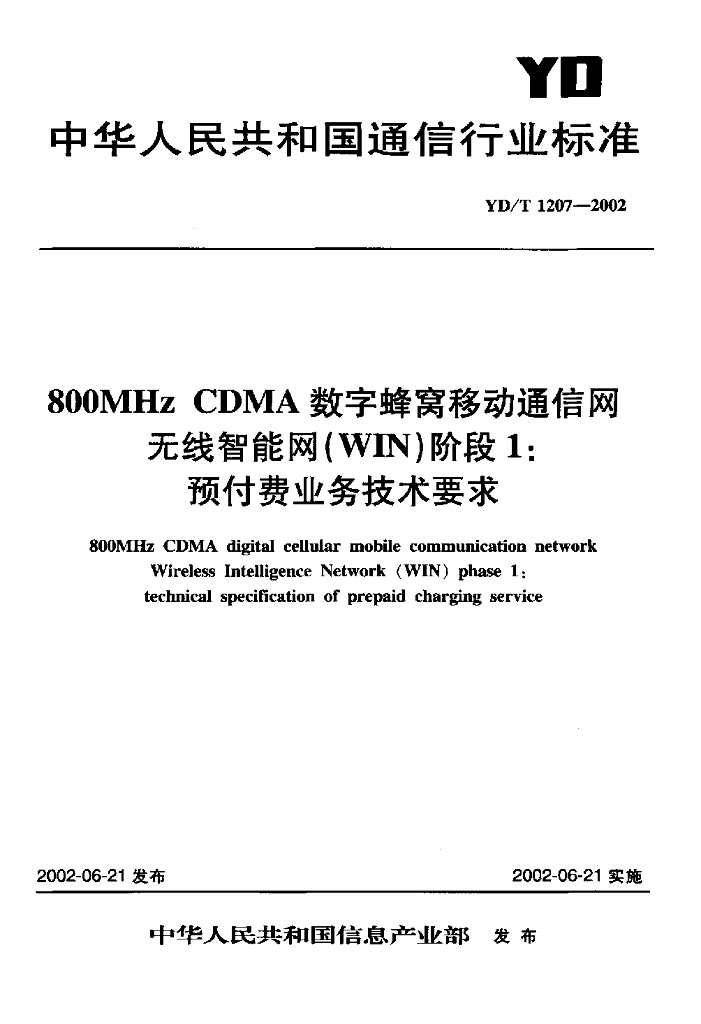 YD/T 1207-2002 800MHz CDMA 数字蜂窝移动通信网无线智能网(WIN)阶段1:预付费业务技术要求