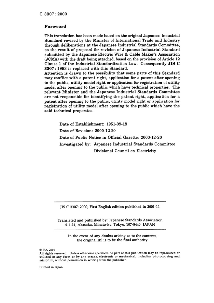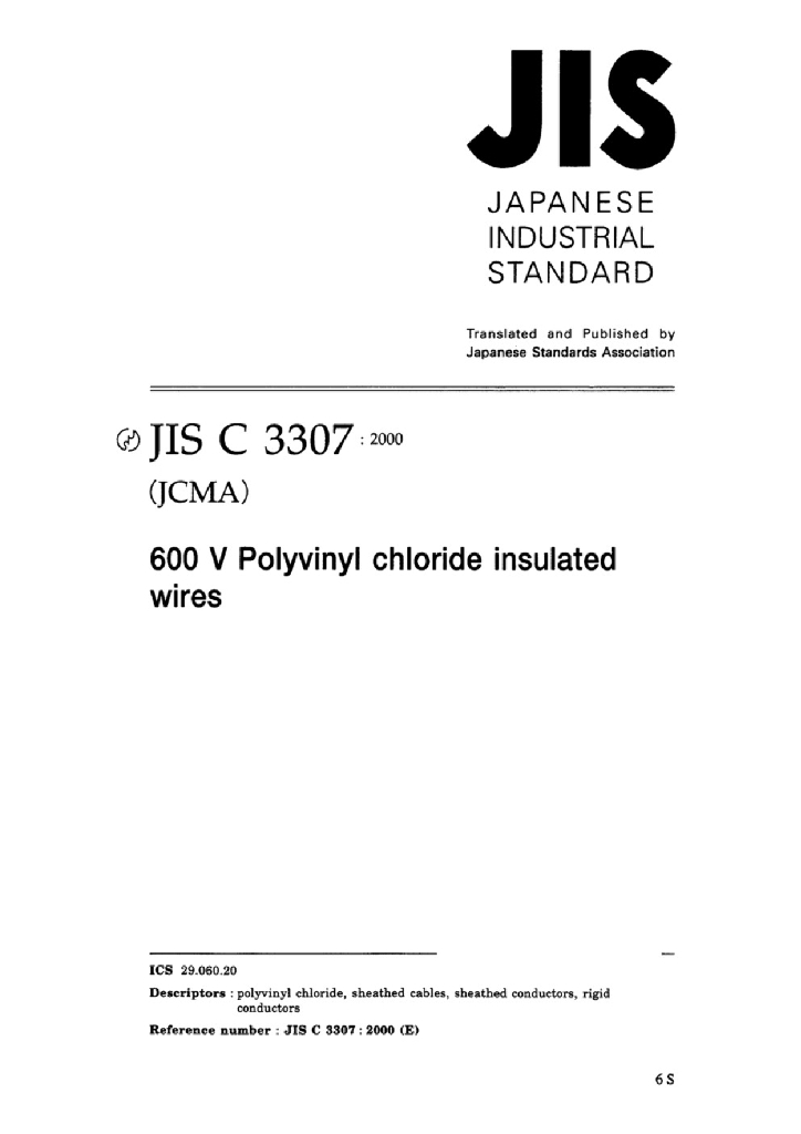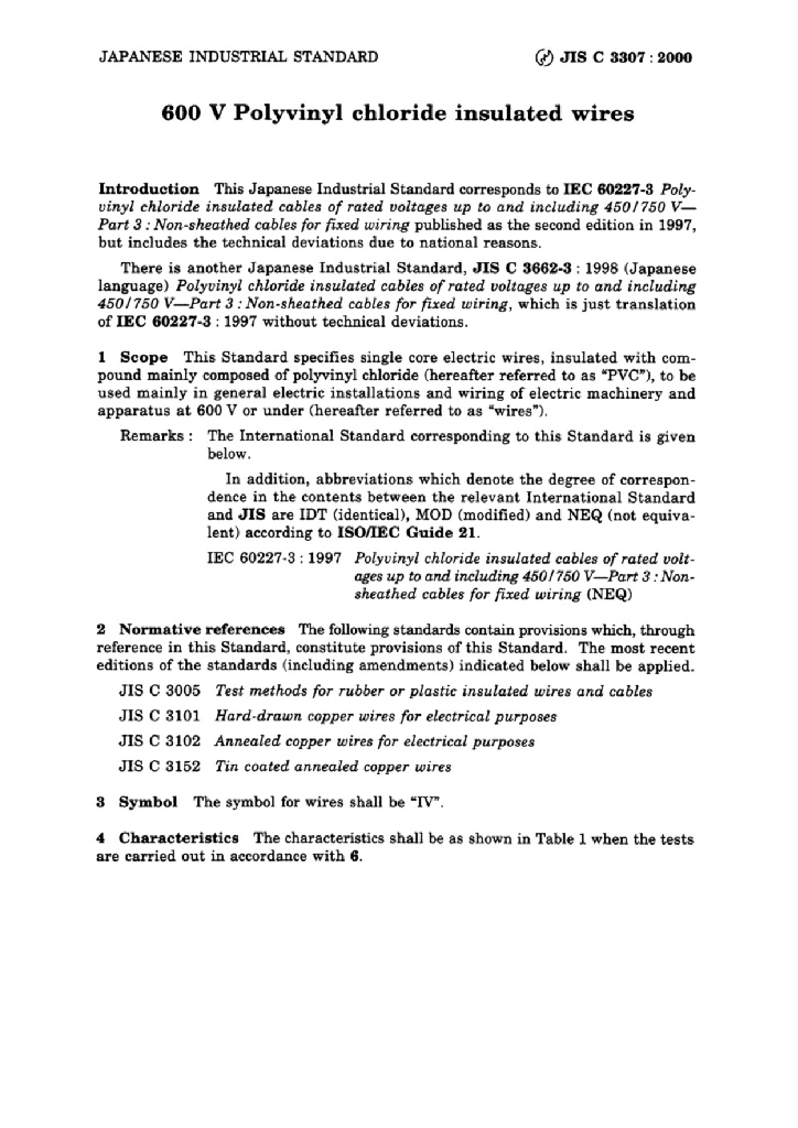 JIS C3307:2000 600V聚氯乙烯绝缘电线