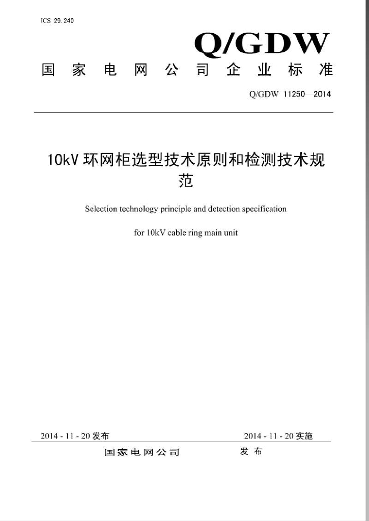 Q/GDW 11250-2014 10kV环网柜选型技术原则和检测技术规范