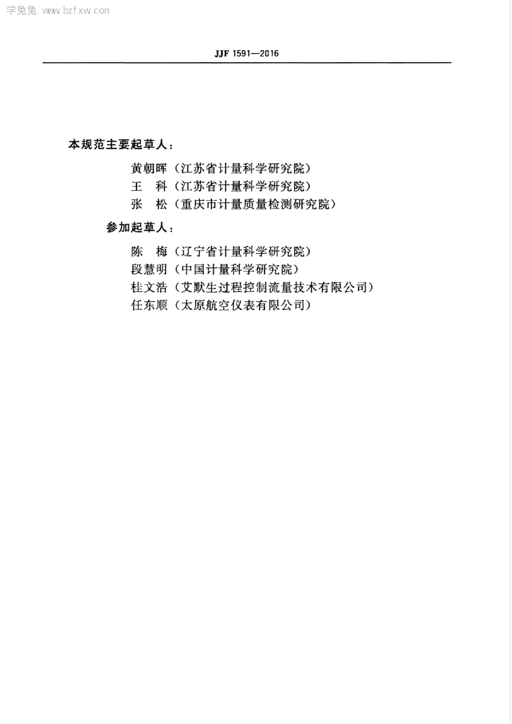 黄朝晖(江苏省计量科学研究院)、王科(江苏省计量科学研究院)、张松(重庆市计量质量检测研究院)、陈梅(辽宁省计量科学研究院)、段慧明(中国计量科学研究院)、桂文浩(艾默生过程控制流量技术有限公司)、任东顺(太原航空仪表有限公司)