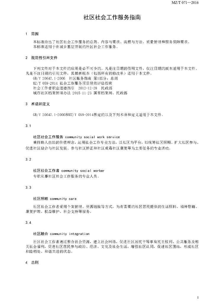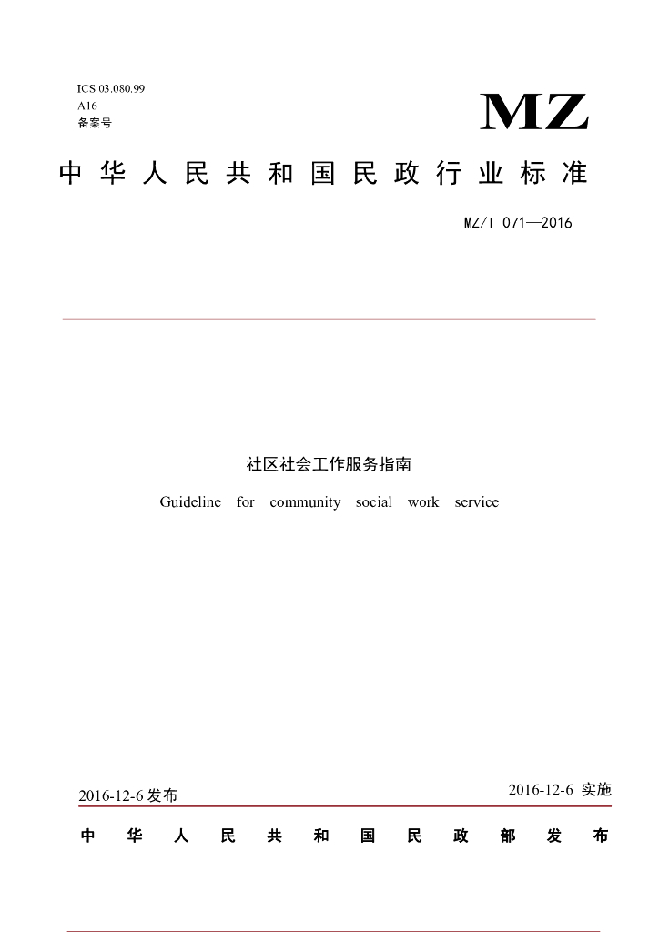 MZ/T 071-2016 社区社会工作服务指南