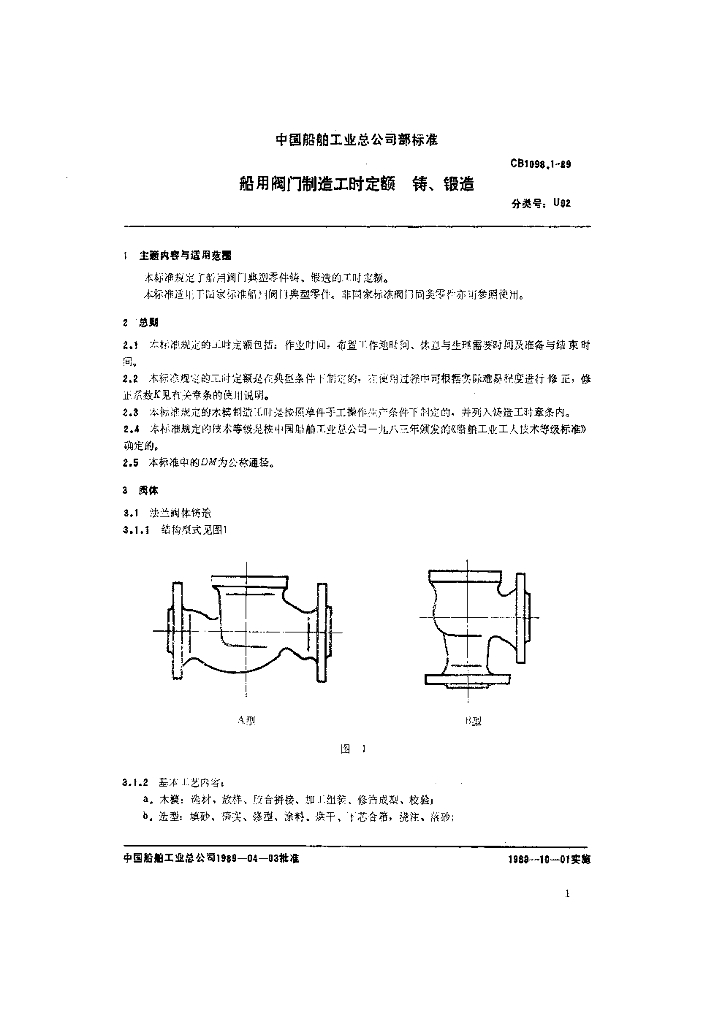 CB 1098.1-1989 船用阀门制造工时定额铸、锻造