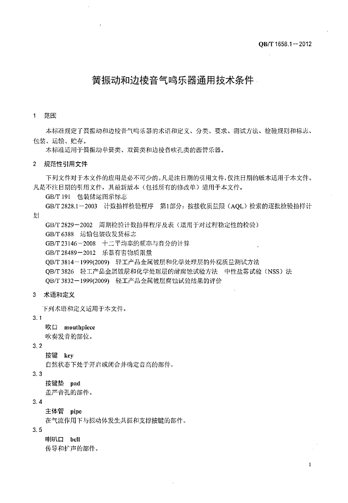 QB/T 1658.1-2012 簧振动和边棱音气鸣乐器通用技术条件