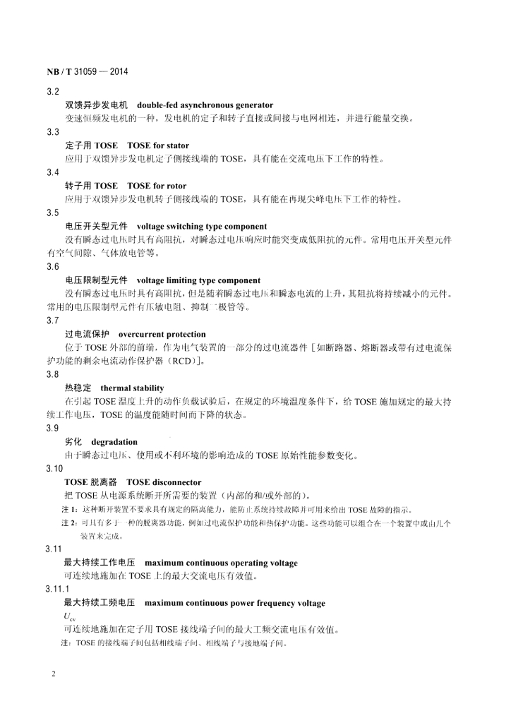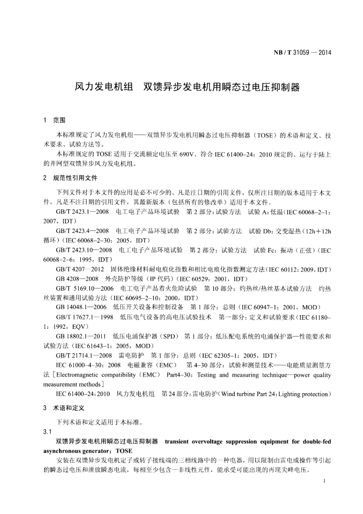 NB/T 31059-2014 风力发电机组 双馈异步发电机用瞬态过电压抑制器