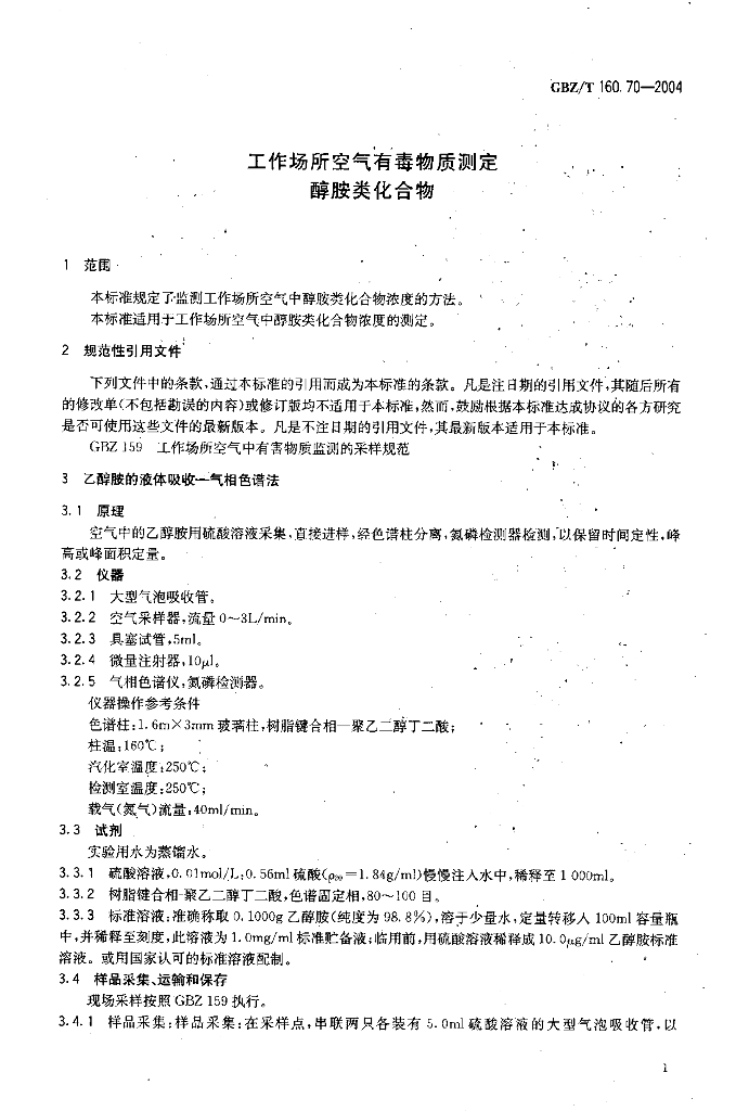 GBZ/T 160.70-2004 工作场所空气有毒物质测定 醇胺类化合物