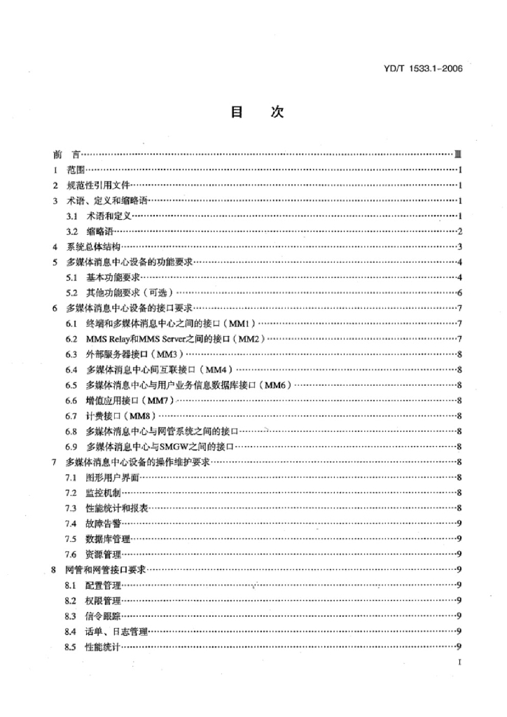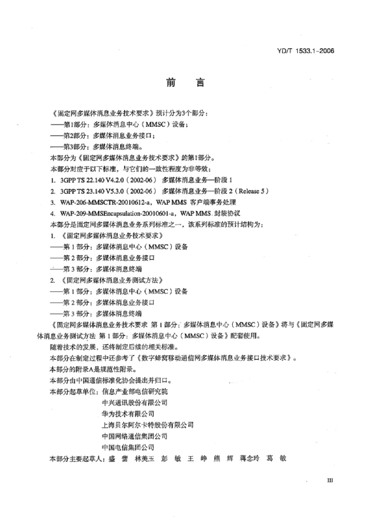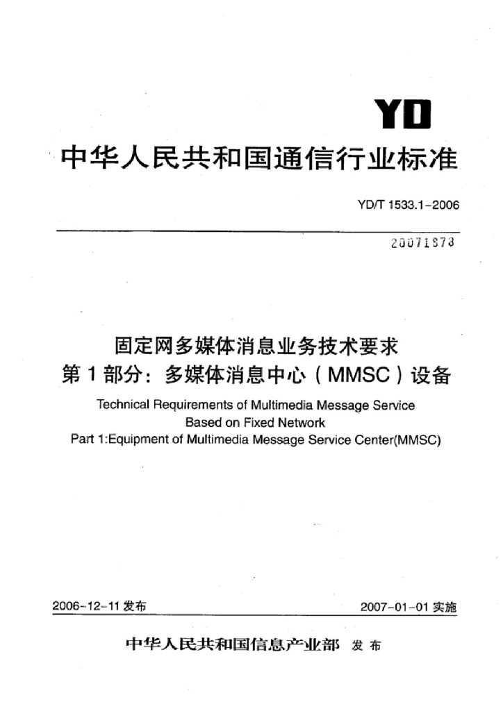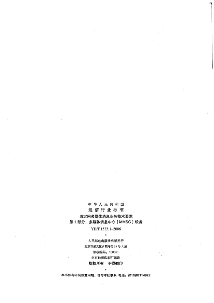 YD/T 1533.1-2006 固定网多媒体消息业务技术要求 第1部分:多媒体消息中心(MMSC)设备