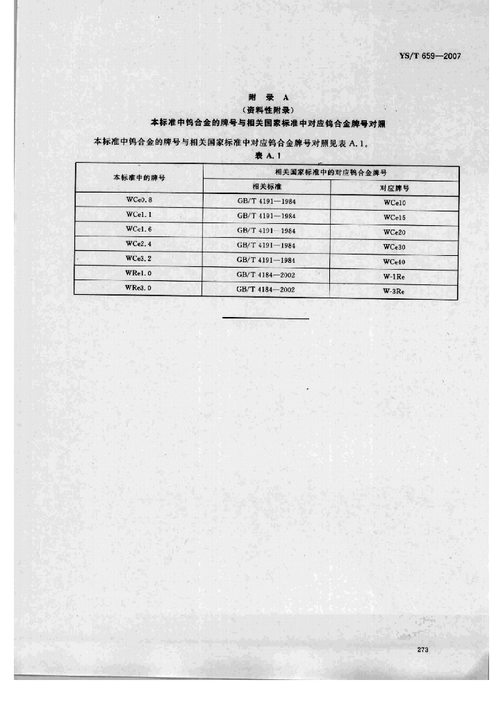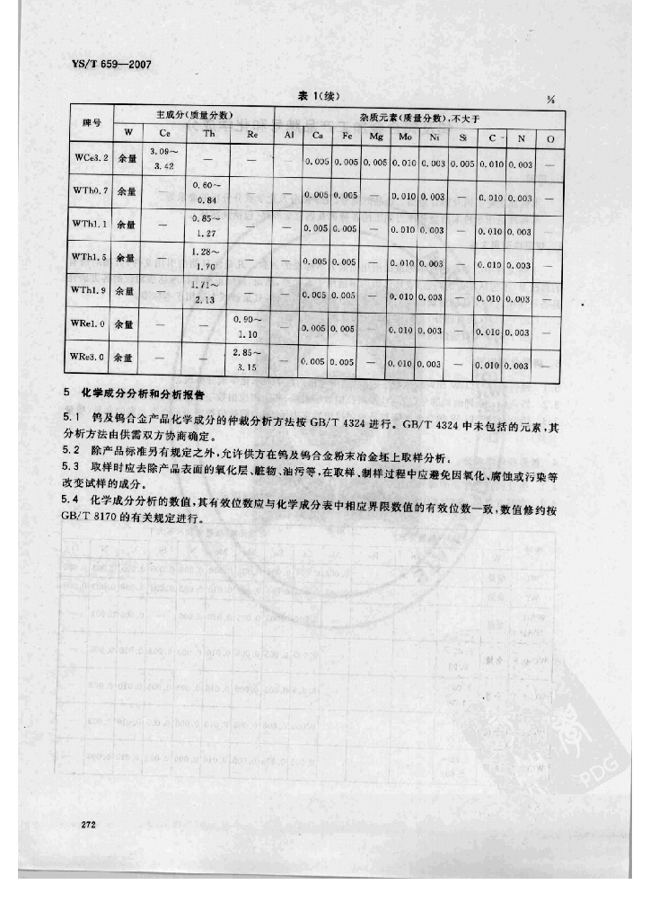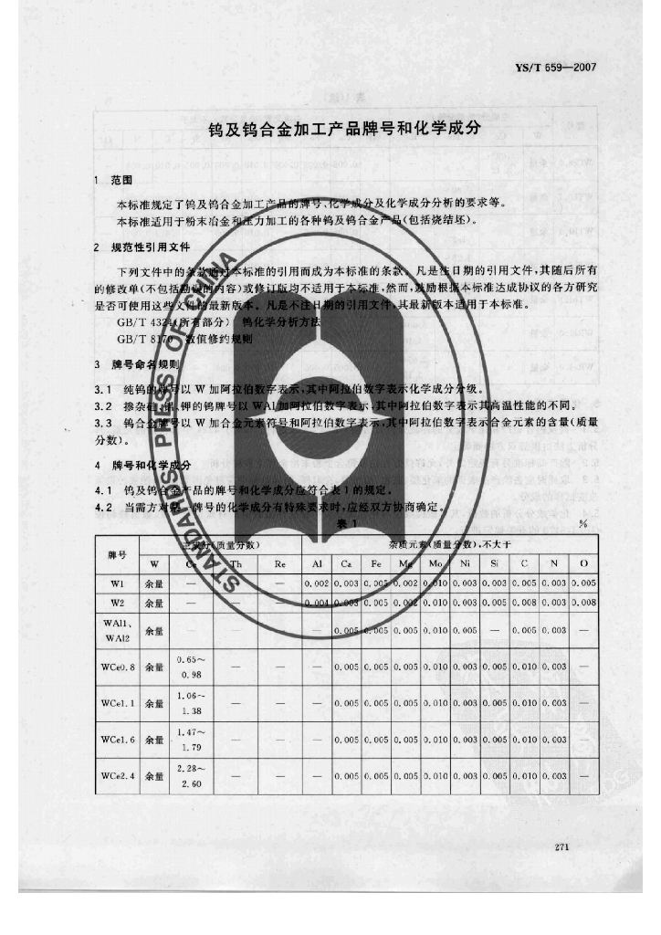 YS/T 659-2007 钨及钨合金加工产品牌号和化学成分