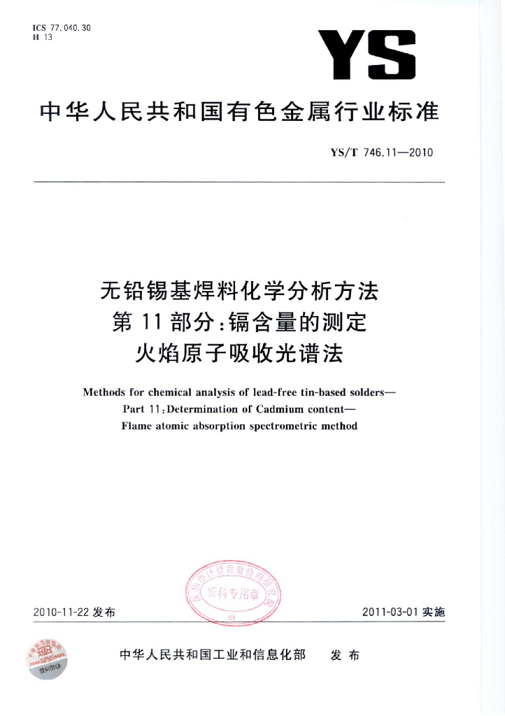 YS/T 746.11-2010 无铅锡基焊料化学分析方法 第11部分:镉含量的测定 火焰原子吸收光谱法