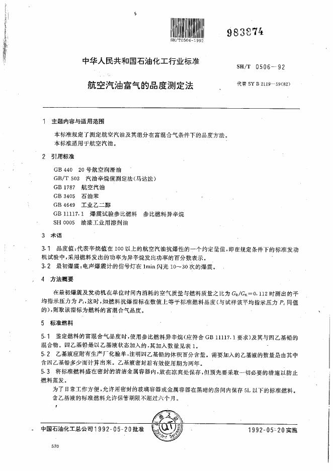 SH/T 0506-1992 航空汽油富气的品度测定法