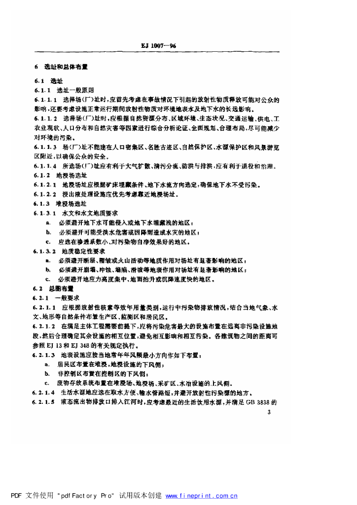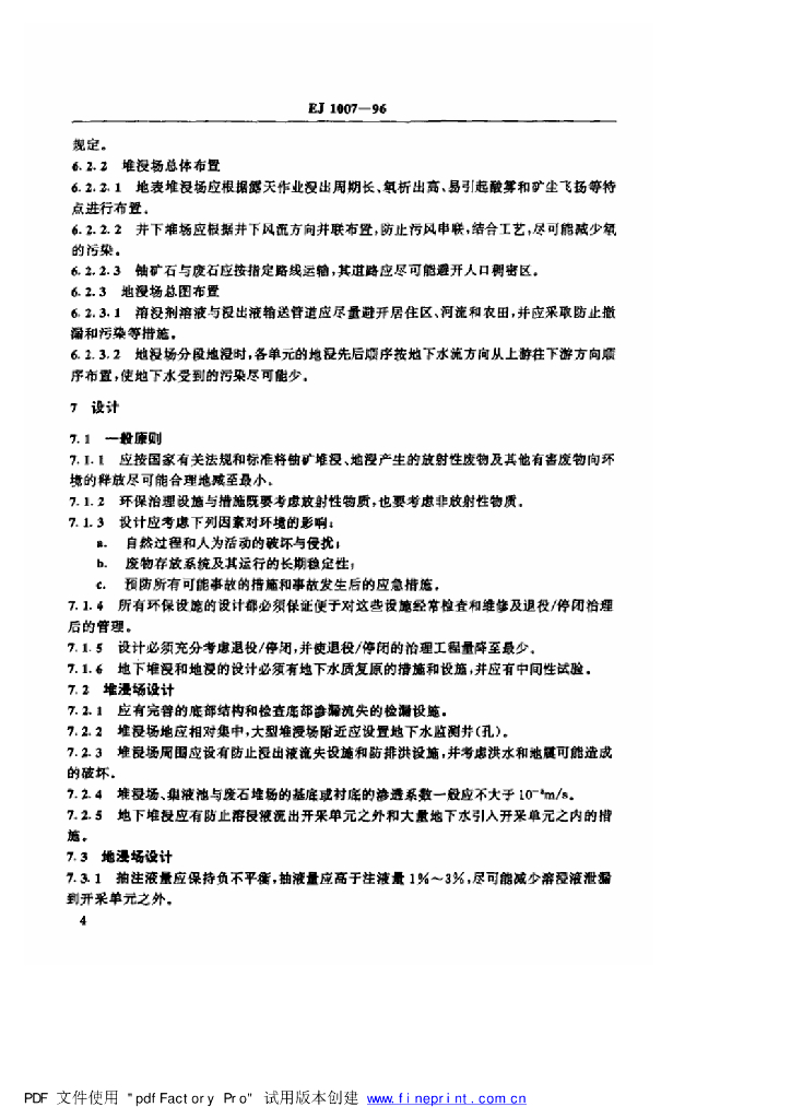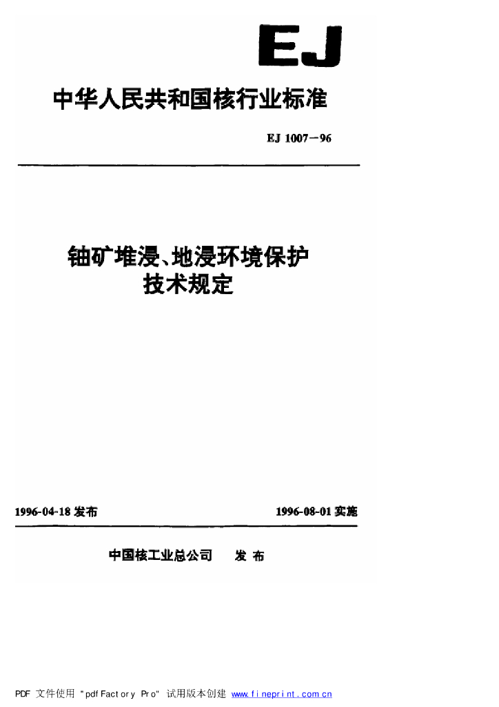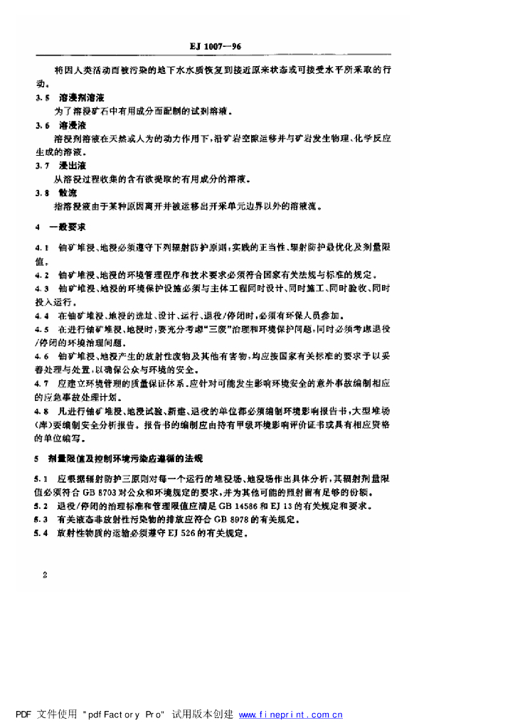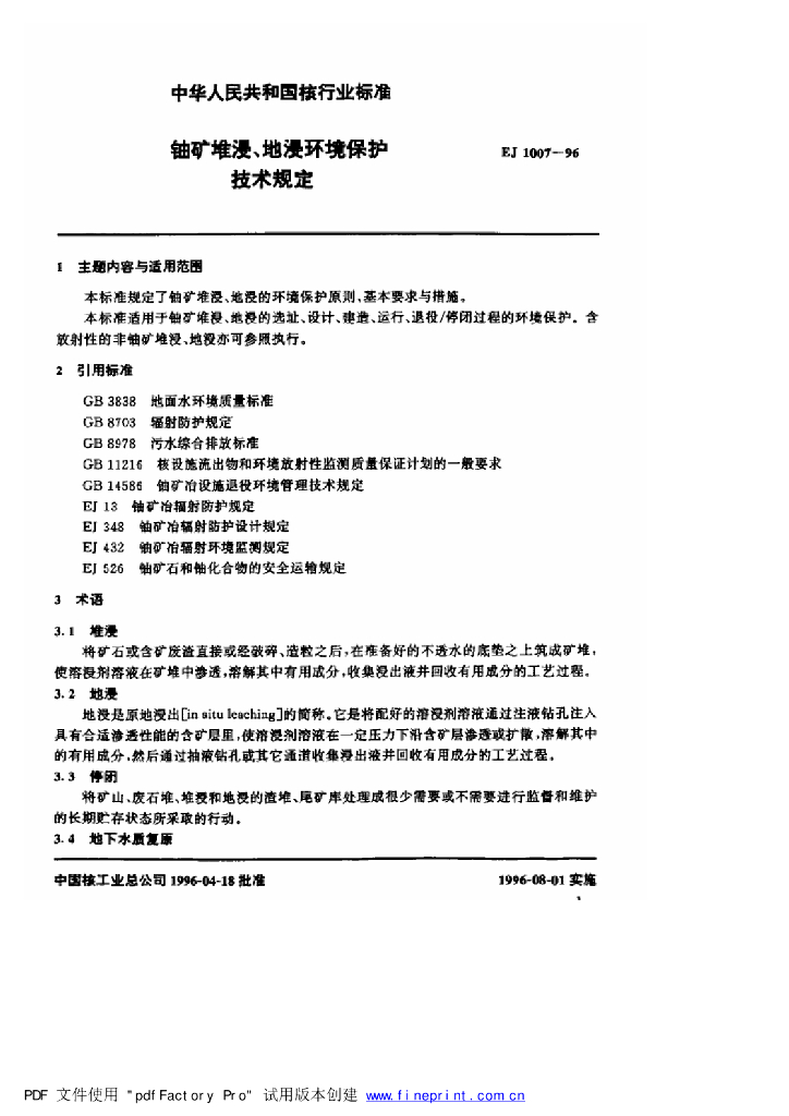 EJ/T 1007-1996 铀矿堆浸、地浸环境保护技术规定