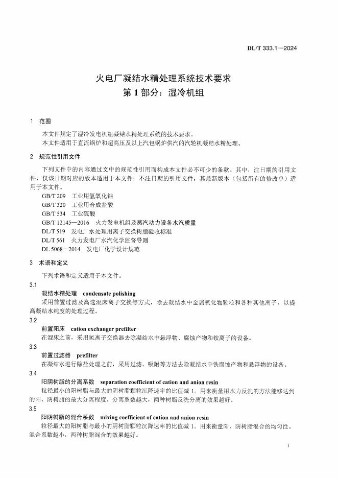 DL/T 333.1-2024 火电厂凝结水精处理系统技术要求 第1部分:湿冷机组