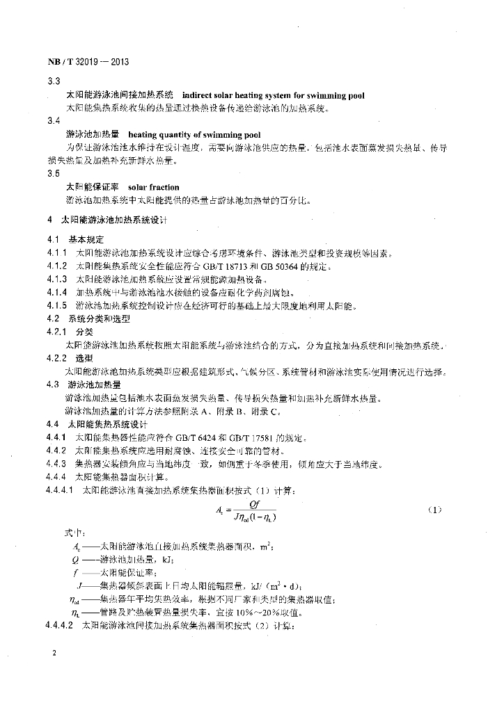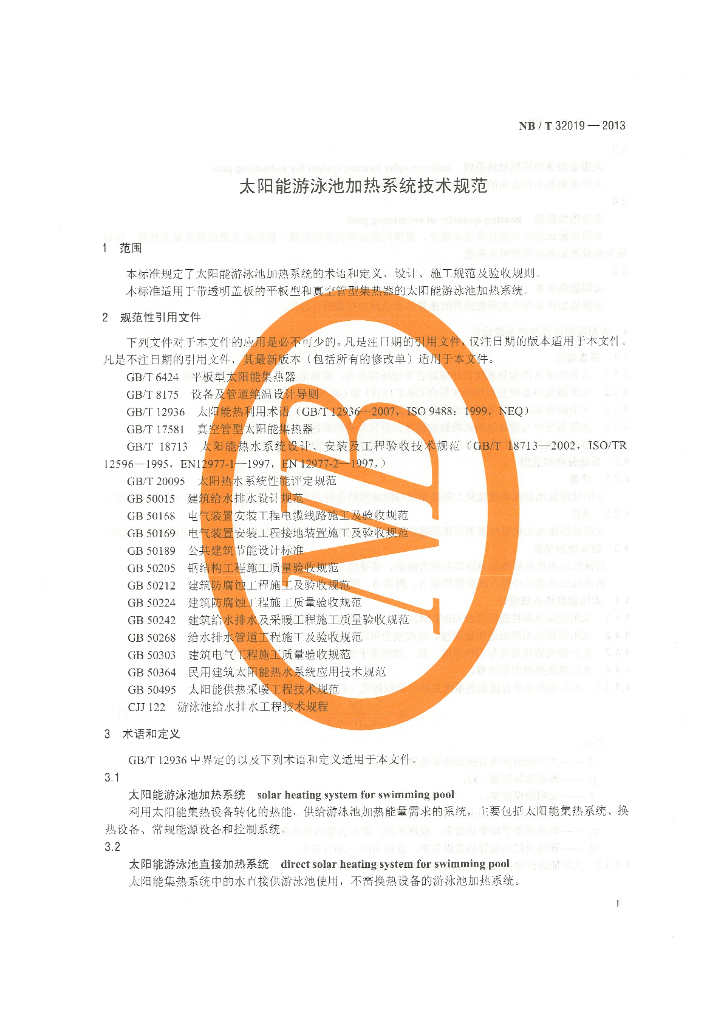 NB/T 32019-2013 太阳能游泳池加热系统技术规范