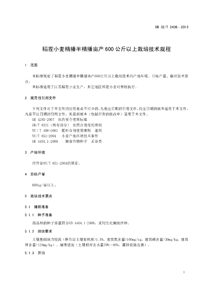 DB32/T 2436-2013 稻茬小麦精播半精播亩产600公斤以上栽培技术规程