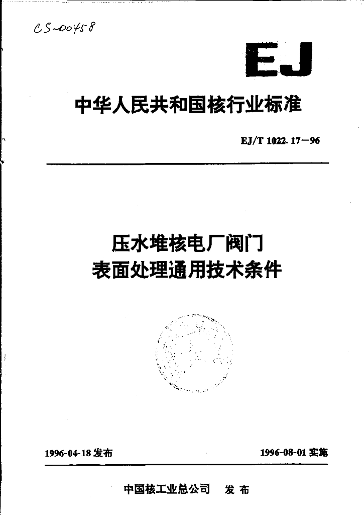 EJ/T 1022.17-1996 压水堆核电厂阀门 表面处理通用技术条件