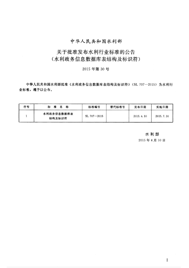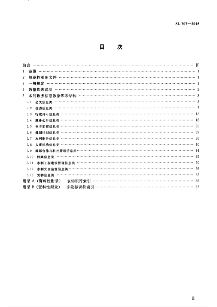 SL/T 707-2015 水利政务信息数据库表结构及标识符