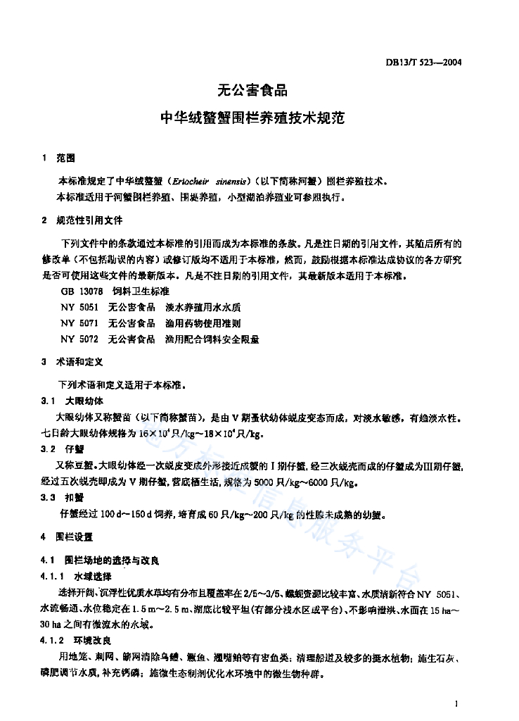 DB13/T 523-2004 无公害食品 中华绒鳌蟹围栏养殖技术规范