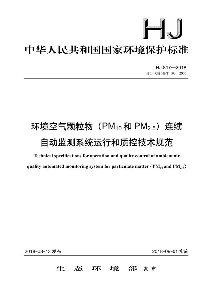 HJ 817-2018 环境空气颗粒物(PM10和PM2.5)连续自动监测系统运行和质控技术规范