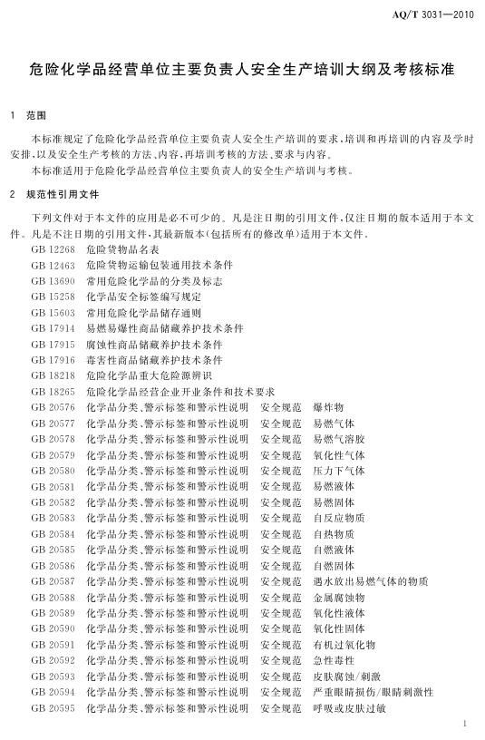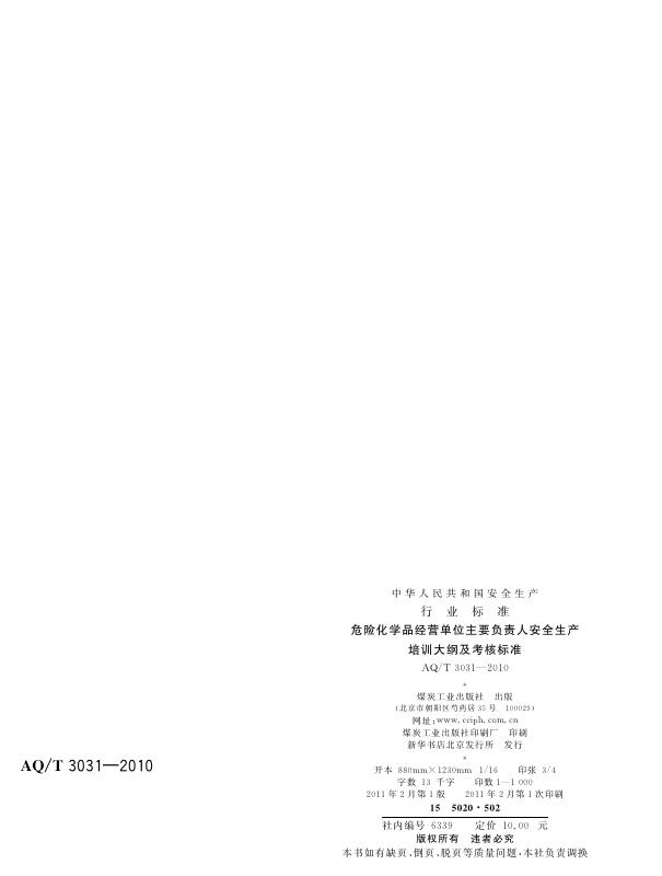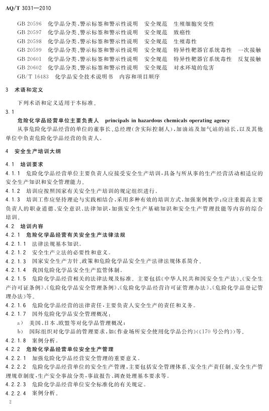 AQ/T 3031-2010 危险化学品经营单位主要负责人安全生产培训大纲及考核标准