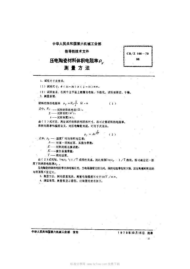CB/Z 166-1979 压电陶瓷材科体积电阻率ρV测量方法