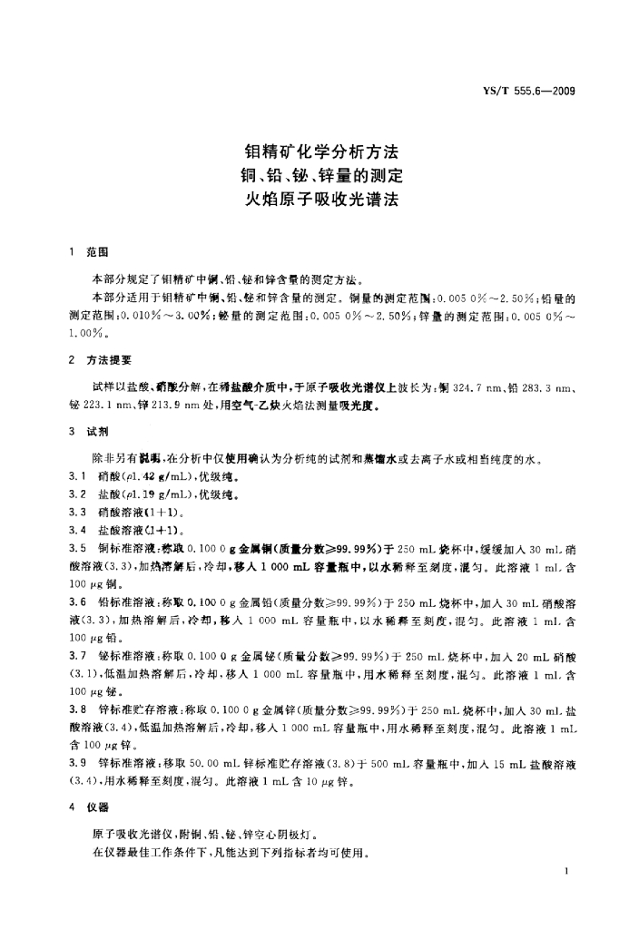 YS/T 555.6-2009 钼精矿化学分析方法铜、铅、铋、锌量的测定火焰原子吸收光谱法