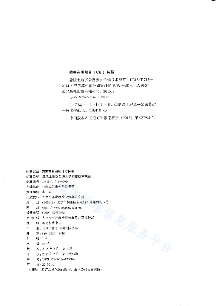 DB15/T 713-2014 盐渍土地区公路养护维修技术规范