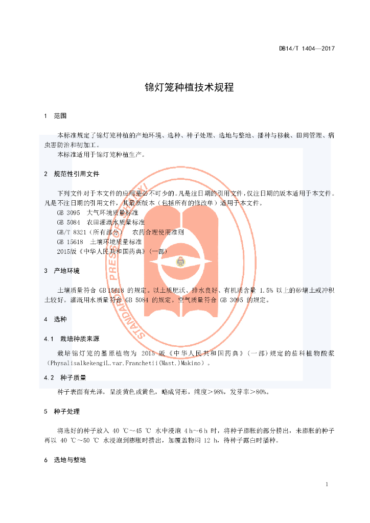 DB14/T 1404-2017 锦灯笼种植技术规程