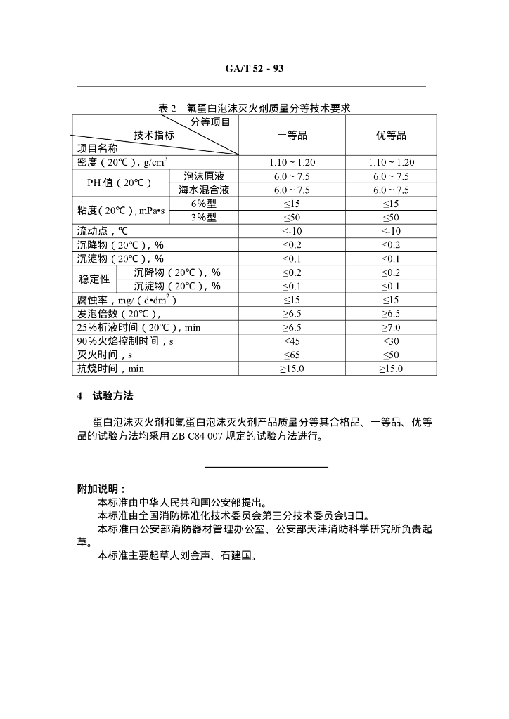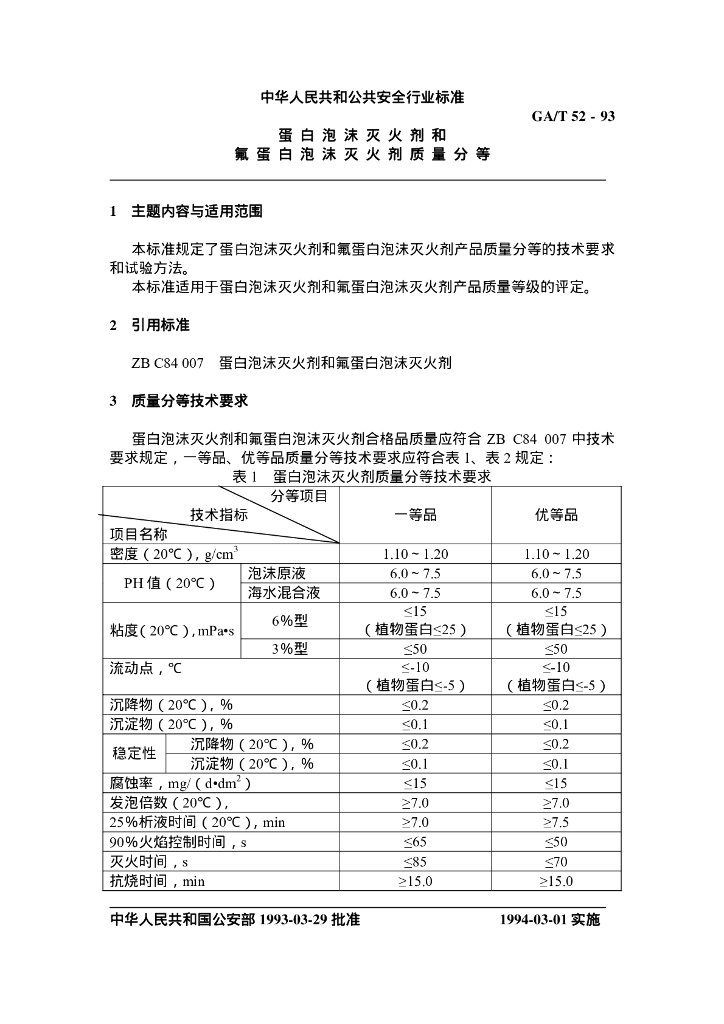 GA/T 52-1993 蛋白泡沫灭火剂和氟蛋白泡沫灭火剂质量分等